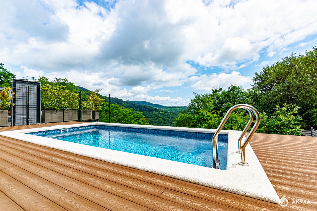 Территория участка террасирована, располагает бассейном. На участке оставлено место под баню или сауну по желанию.