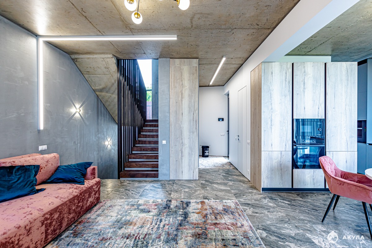 На первом этаже расположены: прихожая, кухня-гостиная с видом на долину и море, санузел. Необходимо добавить, что кухня оснащена кухонным лифтом, для еды , напитков и т.д