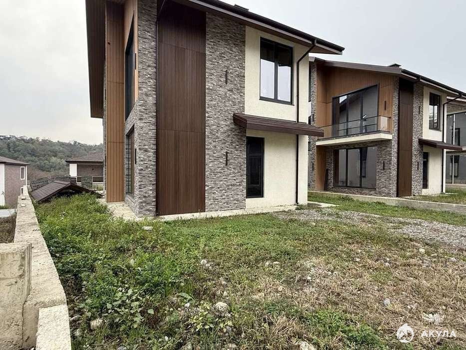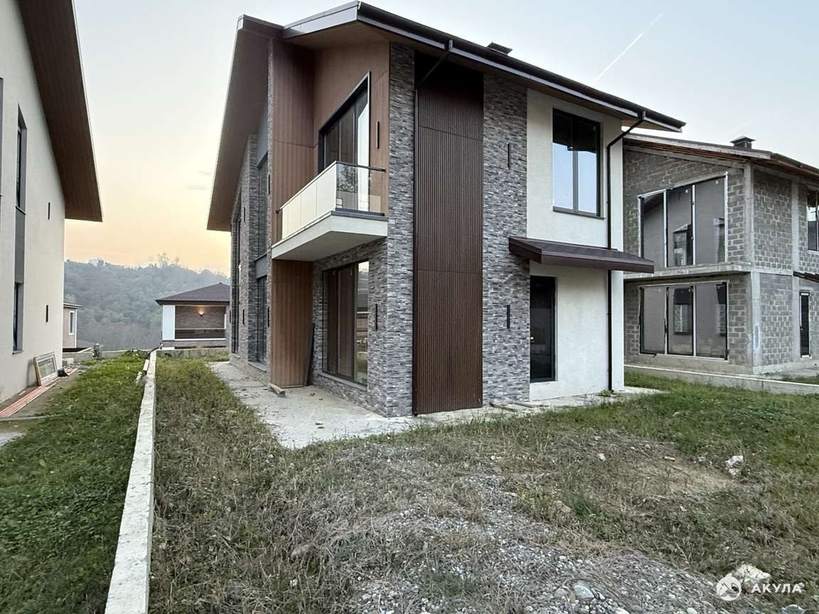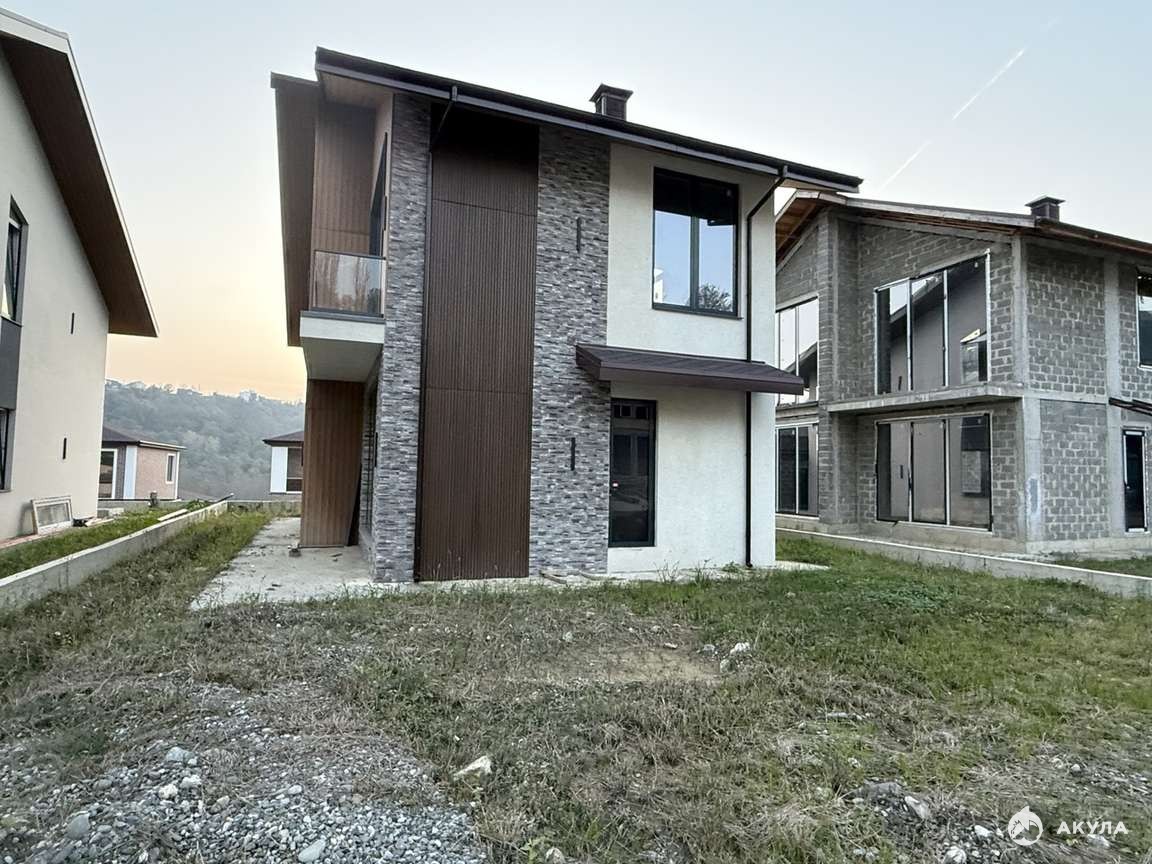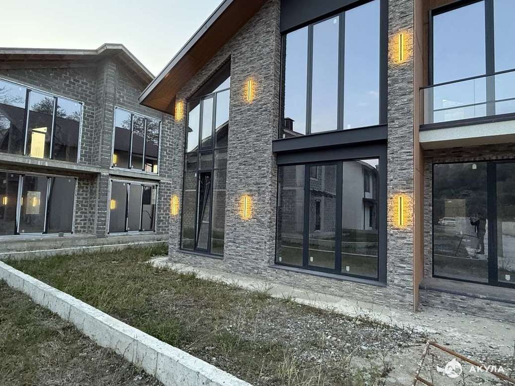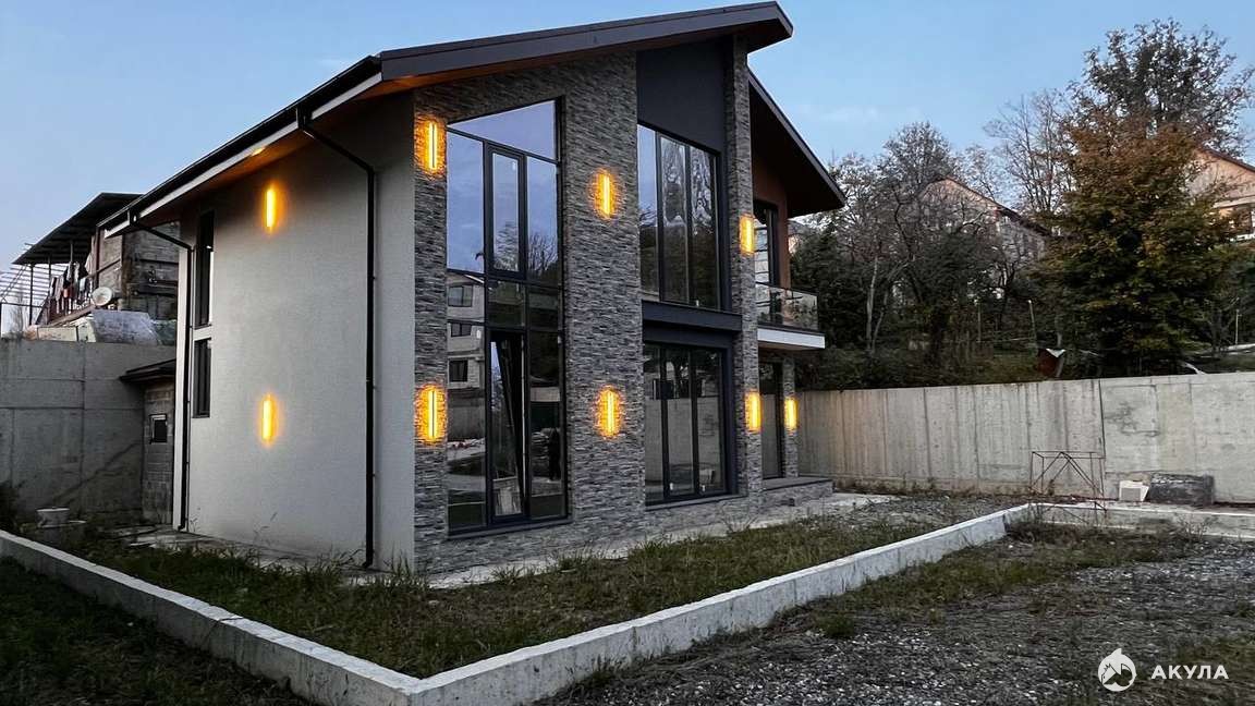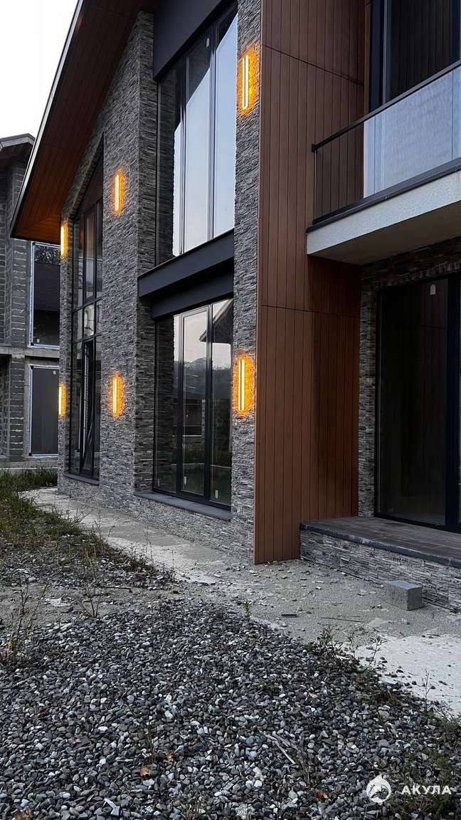 Современный двухэтажный дом в стиле Шале с большими окнами. Фасад в комбинированной отделке (декор-камень + штукатурка), аккуратный участок с видом на зелёный массив. Состояние — предчистовая отделка: дом подготовлен под ваш дизайн проект.