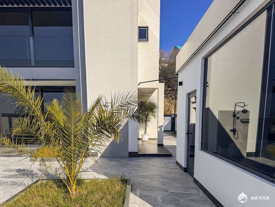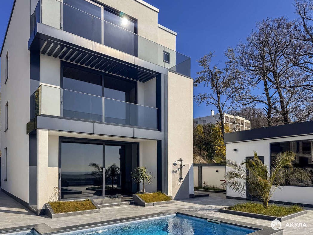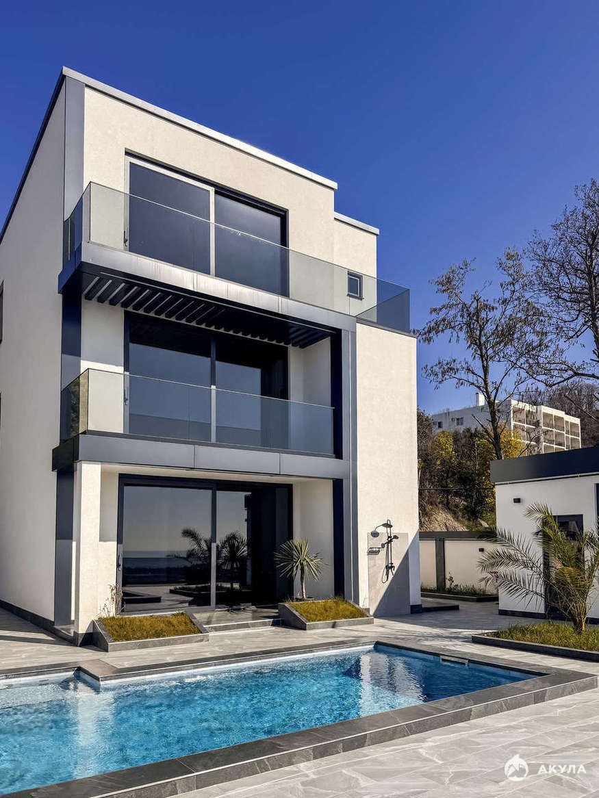 Планировка: первый этаж - кухня-гостиная, санузел и гардеробная, второй этаж - две мастер-спальни с санузлами и гардеробная, третий этаж - мастер спальня с санузлом и гардеробной, спальня и санузел. Установлен алюминиевый панорамный профиль, остекление с термоизоляцией.