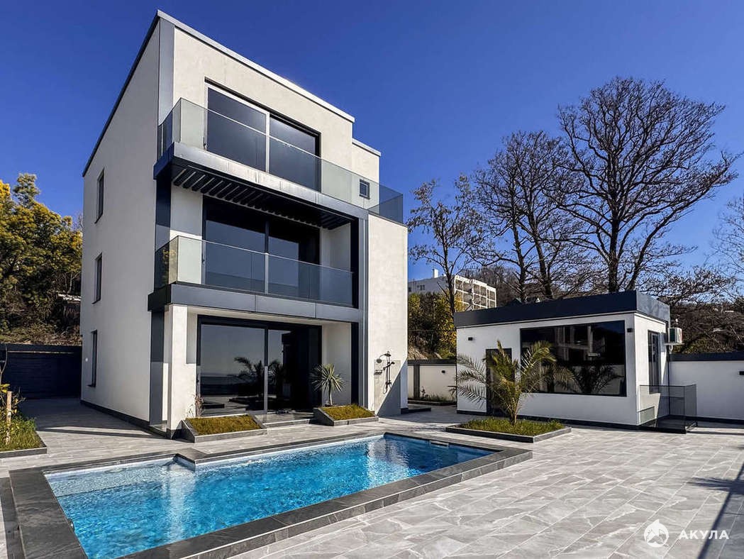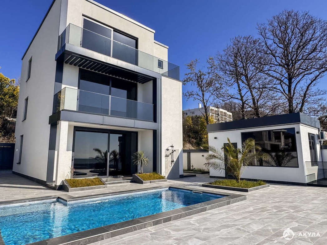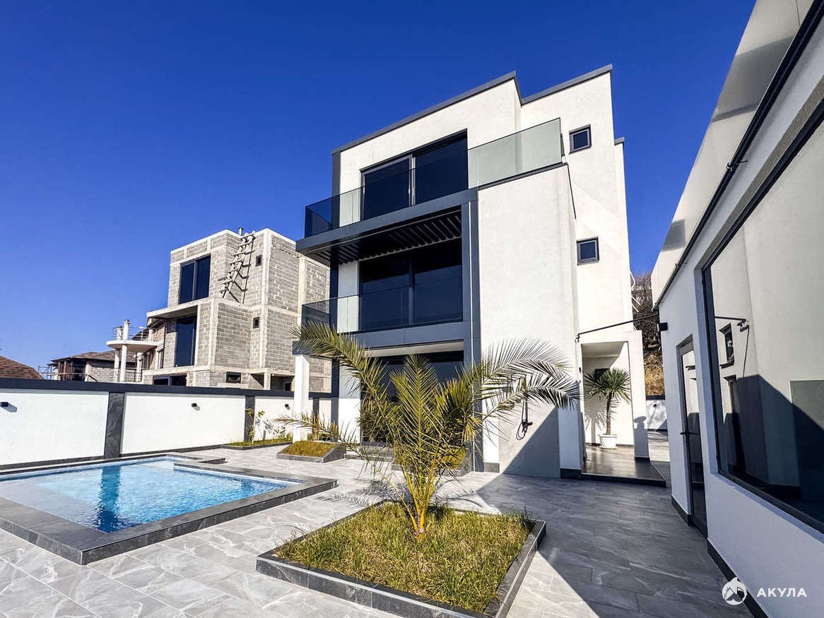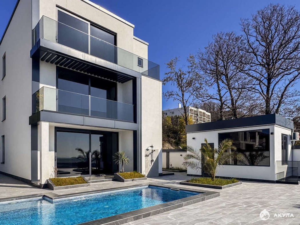 Планировка: первый этаж - кухня-гостиная, санузел и гардеробная, второй этаж - две мастер-спальни с санузлами и гардеробная, третий этаж - мастер спальня с санузлом и гардеробной, спальня и санузел. Установлен алюминиевый панорамный профиль, остекление с термоизоляцией.