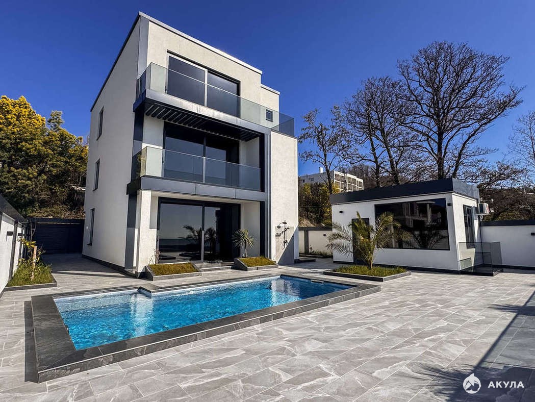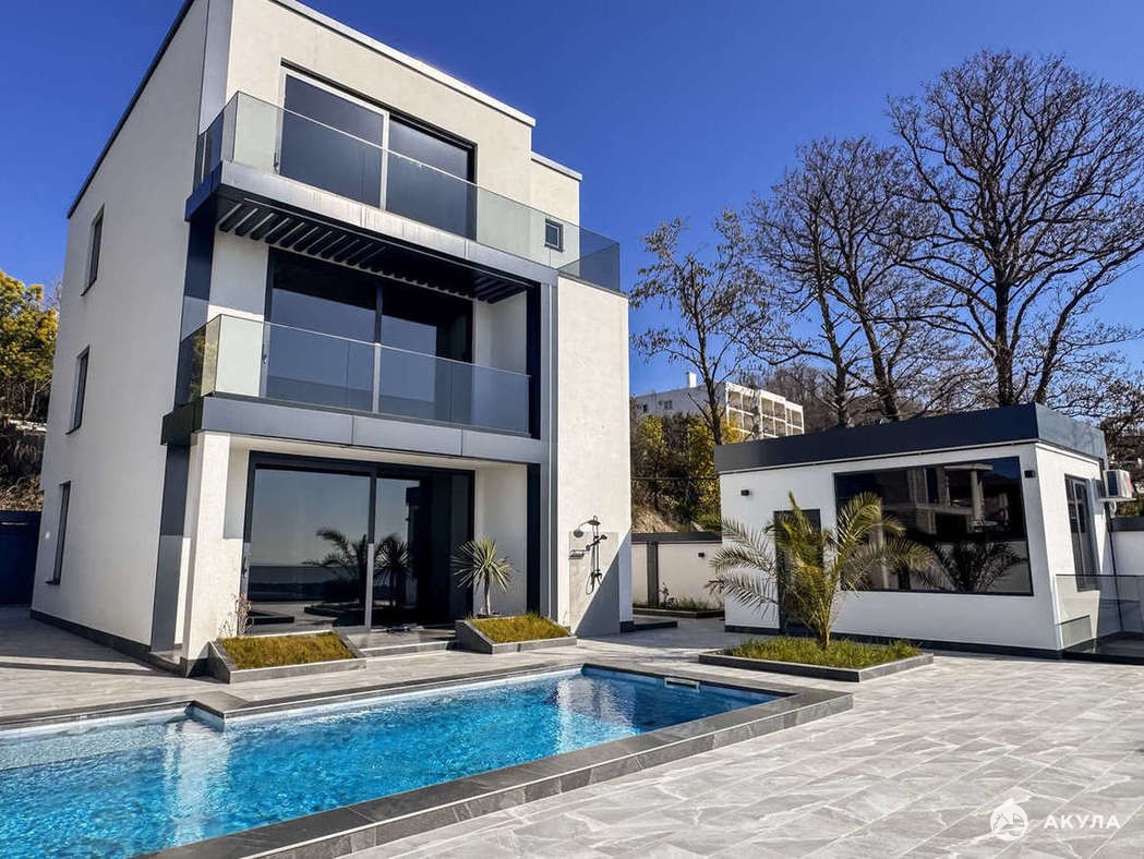 Дом монолитный, опорный конструктив и фундамент выполнен на сваях. Внутри - 275 квадратных метров функциональной планировки в чистовой отделке. 1 этаж - холл, котельная, кухня-гостиная с выходом на террасу у бассейна, санузел, 2 этаж - 2 мастер-спальни и кабинет, 3 этаж - 2 мастер-спальни и детская. Из всех окон открывается потрясающий вид на море и огни Олимпийских объектов! Этот вид никто никогда уже не перекроет, что очень редко и важно для Сочи.