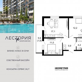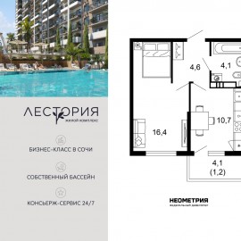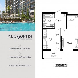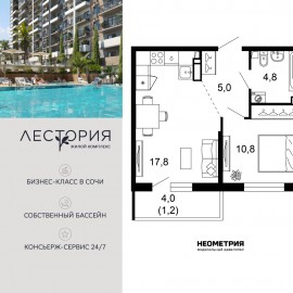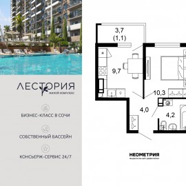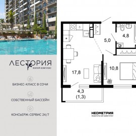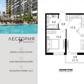 Продается квартира в жилом комплексе бизнес-класса «Лестория». В составе ЖК предусмотрена собственная аквазона площадью 473 квадратных метра с двумя подогреваемыми бассейнами, что соответствуют стандартам бизнес-класса. Аквазона объединяет взрослый и детский бассейны....