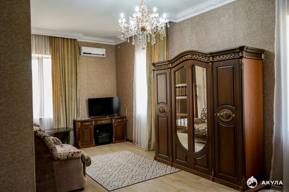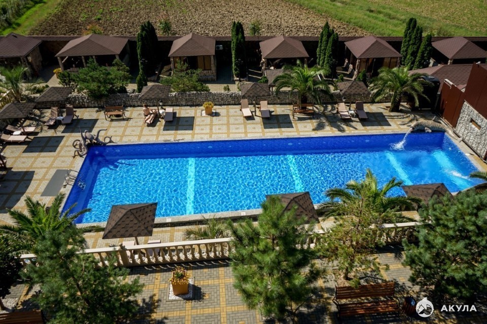На 50 сотках с закрытой территорией с видеонаблюдением расположены 2 корпуса, большой подогреваемый бассейн, мангальная зона с открытыми и закрытыми беседками, зона отдыха, детская площадка. Во втором корпусе расположены СПА комплекс и ресторан.