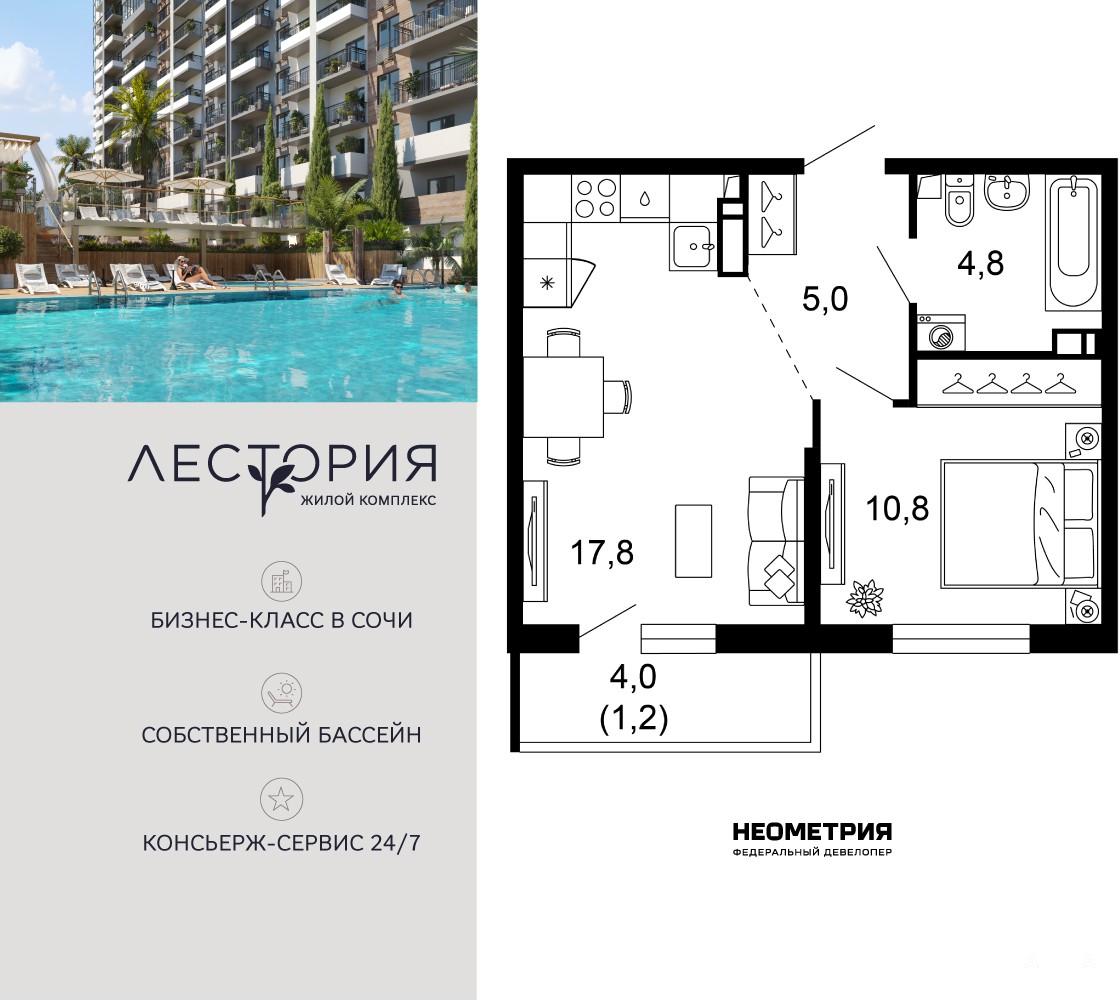 Продается квартира в жилом комплексе бизнес-класса «Лестория». В составе ЖК предусмотрена собственная аквазона площадью 473 квадратных метра с двумя подогреваемыми бассейнами, что соответствуют стандартам бизнес-класса.