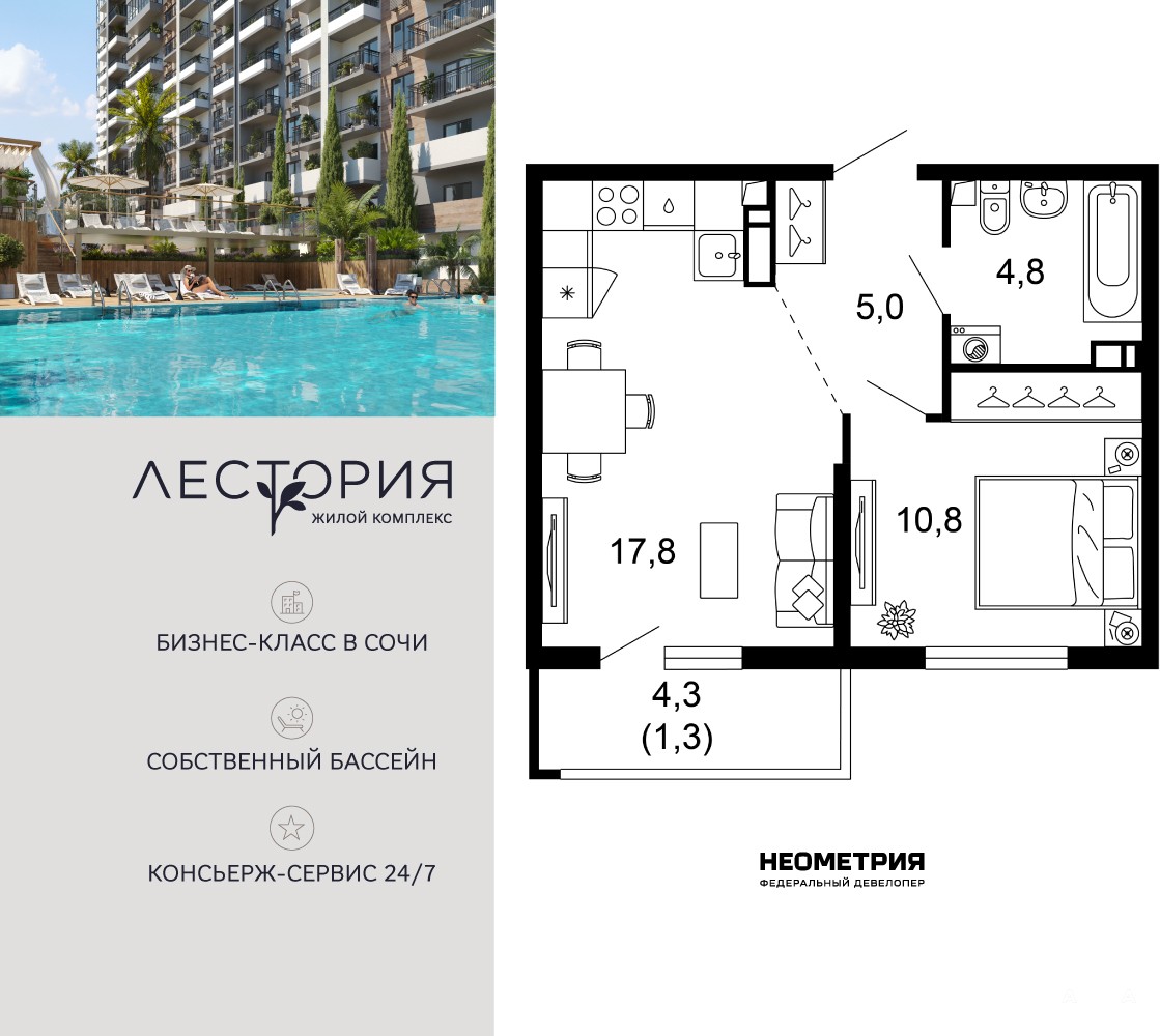 Продается квартира в жилом комплексе бизнес-класса «Лестория». В составе ЖК предусмотрена собственная аквазона площадью 473 квадратных метра с двумя подогреваемыми бассейнами, что соответствуют стандартам бизнес-класса.