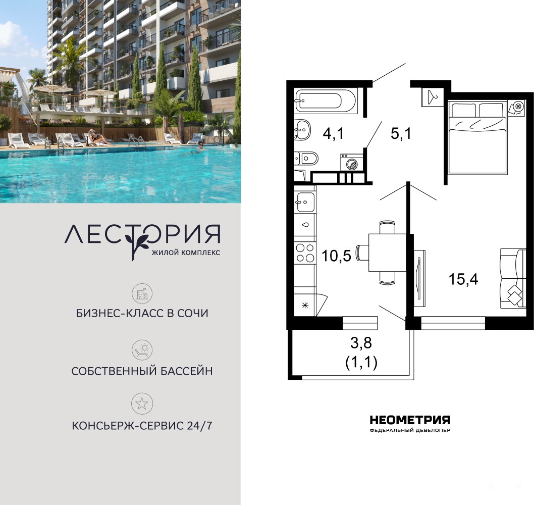 Продается квартира в жилом комплексе бизнес-класса «Лестория». В составе ЖК предусмотрена собственная аквазона площадью 473 квадратных метра с двумя подогреваемыми бассейнами, что соответствуют стандартам бизнес-класса.