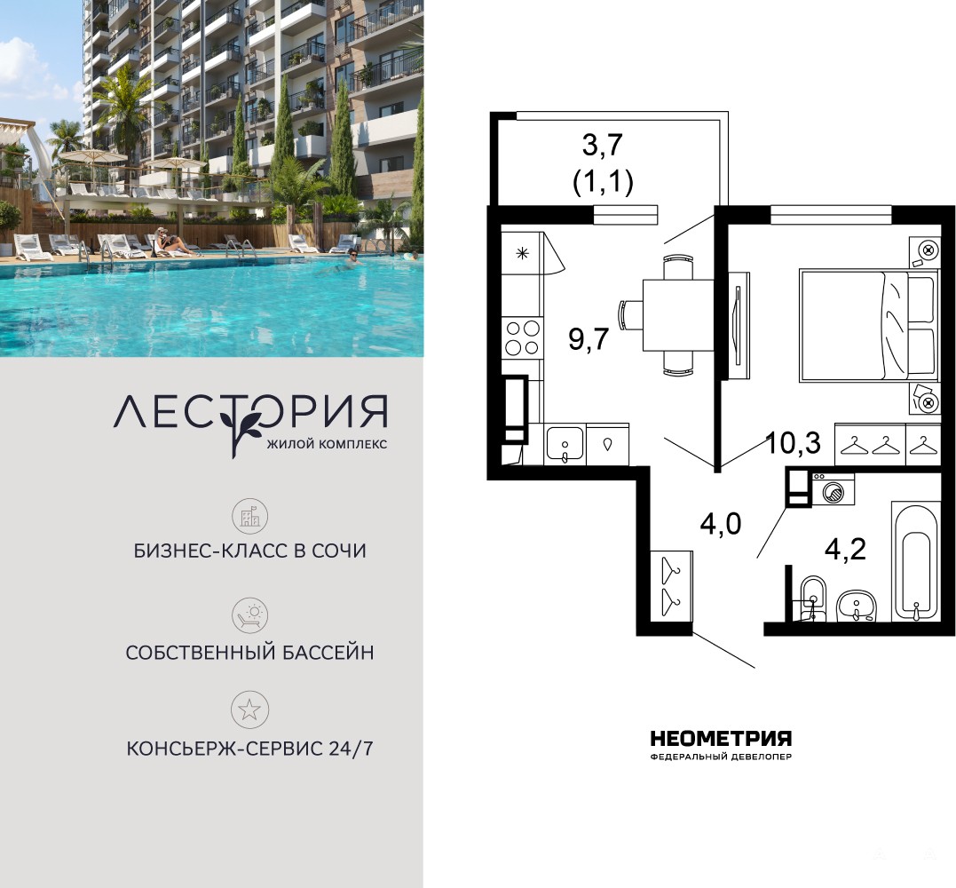Продается квартира в жилом комплексе бизнес-класса «Лестория». В составе ЖК предусмотрена собственная аквазона площадью 473 квадратных метра с двумя подогреваемыми бассейнами, что соответствуют стандартам бизнес-класса.