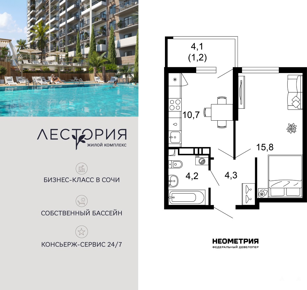 Продается квартира в жилом комплексе бизнес-класса «Лестория». В составе ЖК предусмотрена собственная аквазона площадью 473 квадратных метра с двумя подогреваемыми бассейнами, что соответствуют стандартам бизнес-класса.