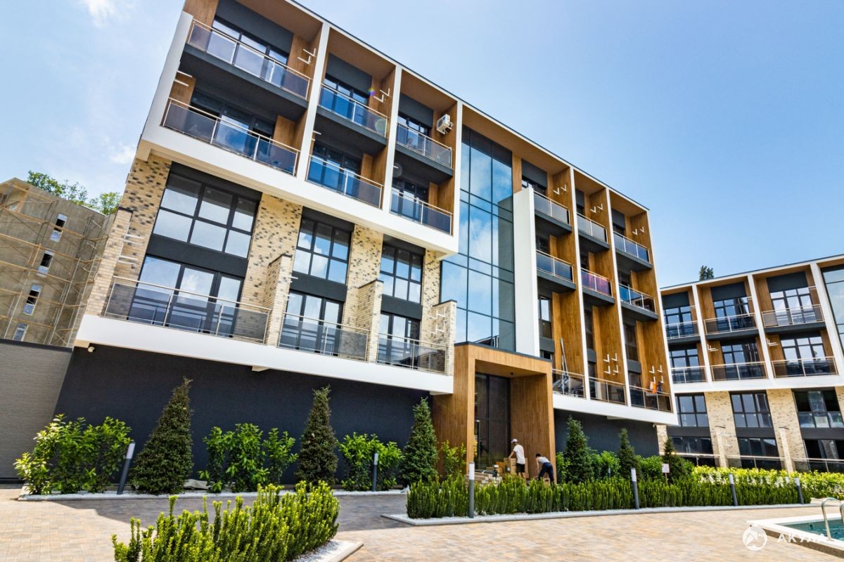 На территории комплекса оборудованы детские площадки, футбольное поле, фитнес-центр, столовая, зоны отдыха, бассейн с мини-баром, закрытая частная территория, паркинг, вид комплекса на зеленый массив.