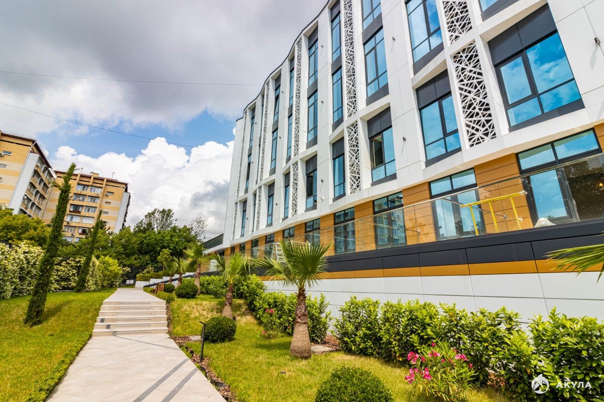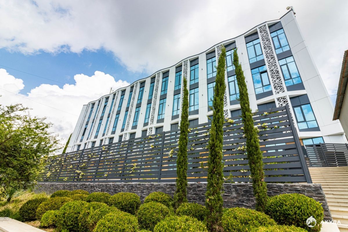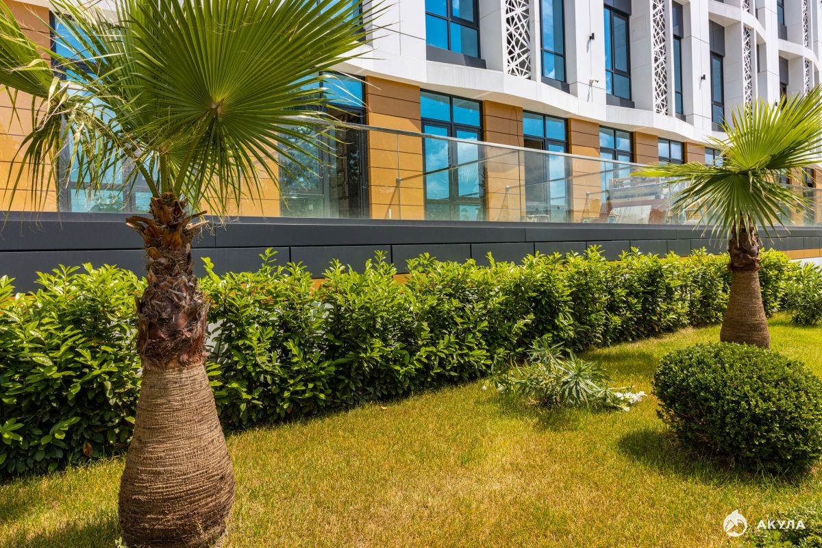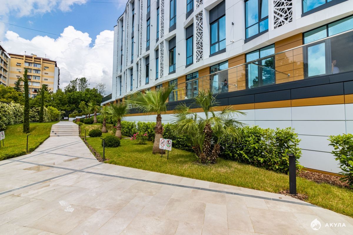В апартаменте большие панорамные окна с витражным остеклением, из которых открывается вид на парковую зону, город и море.