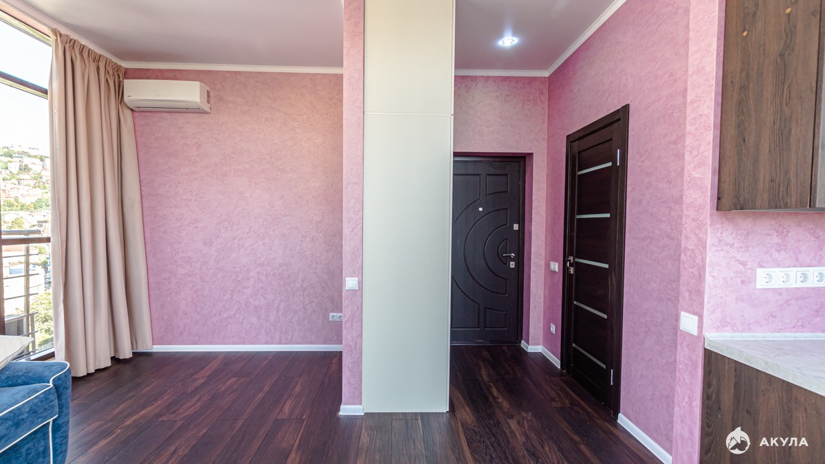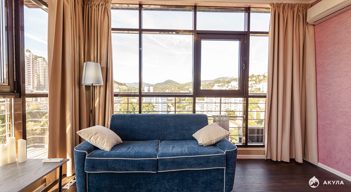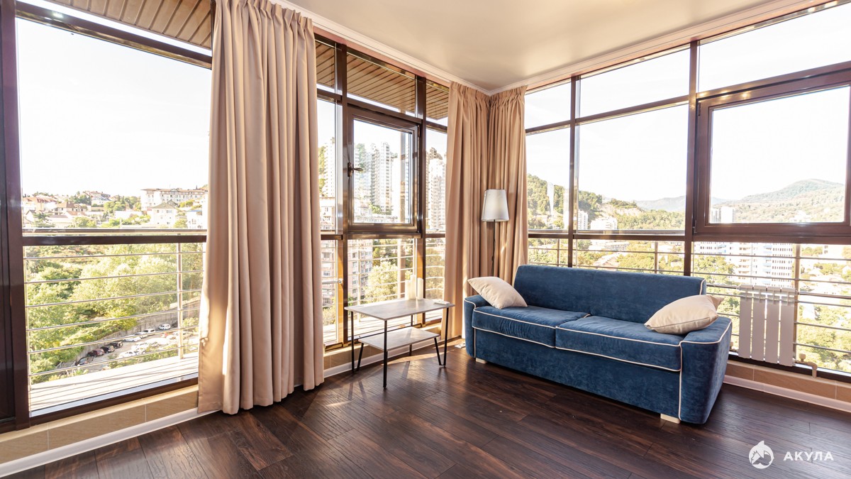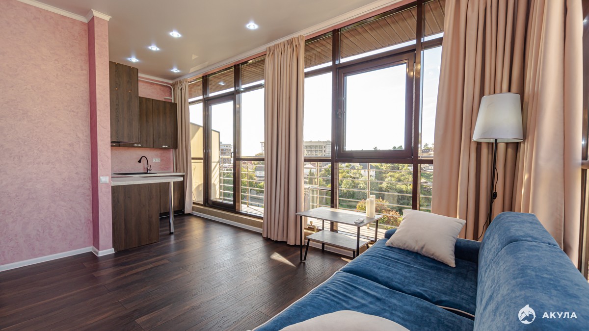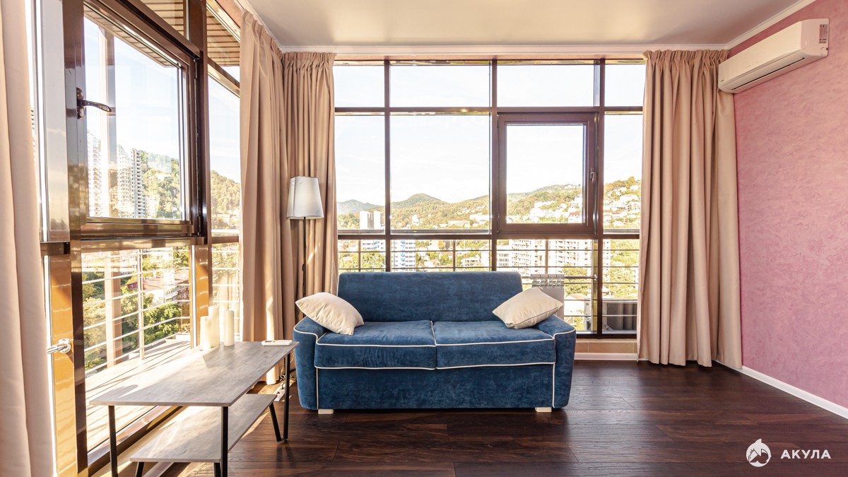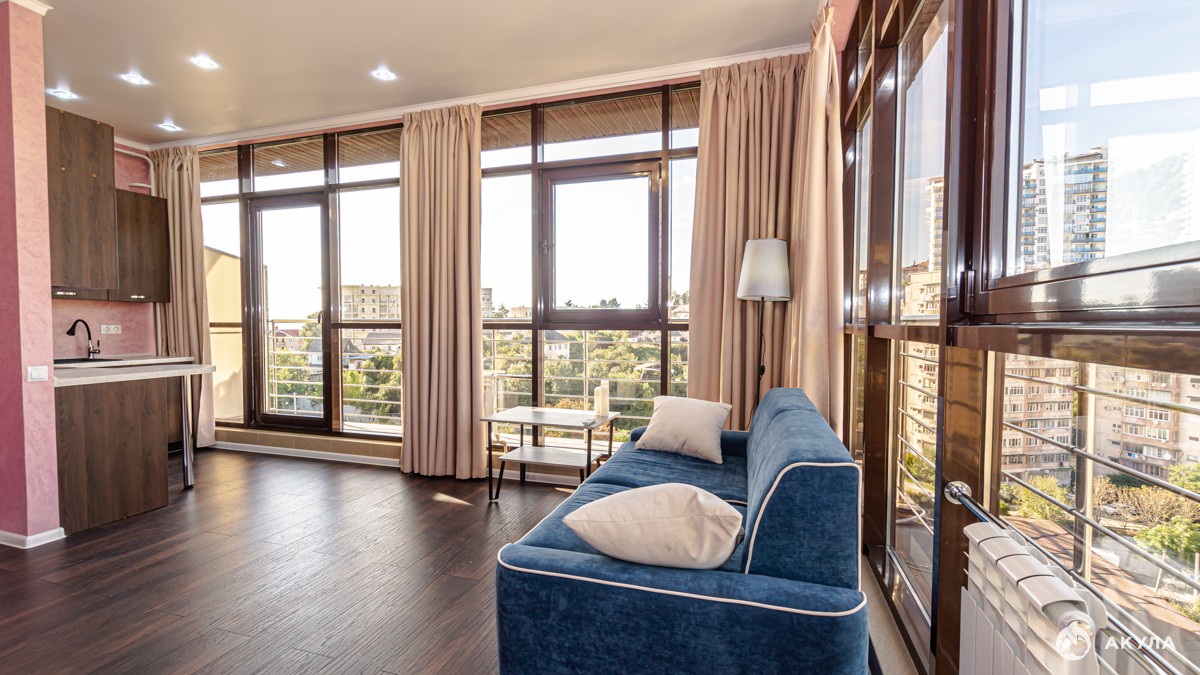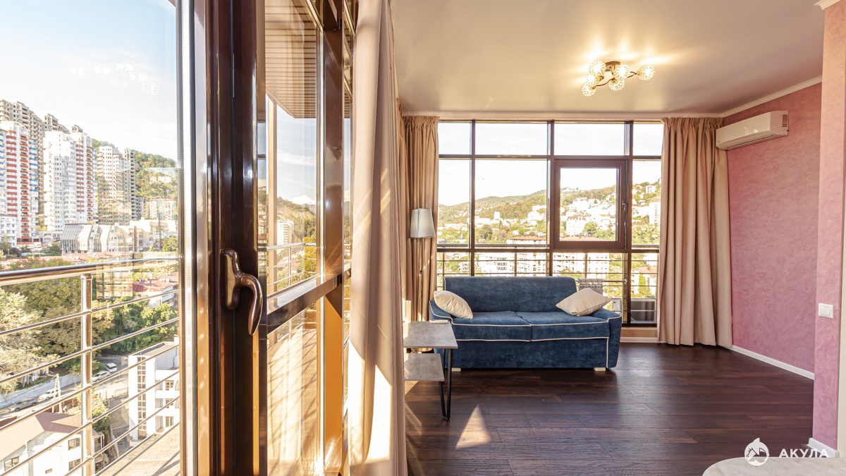Квартира с папорамными окнами, большим открытым балконом, великолепным видом на город, горы и море.