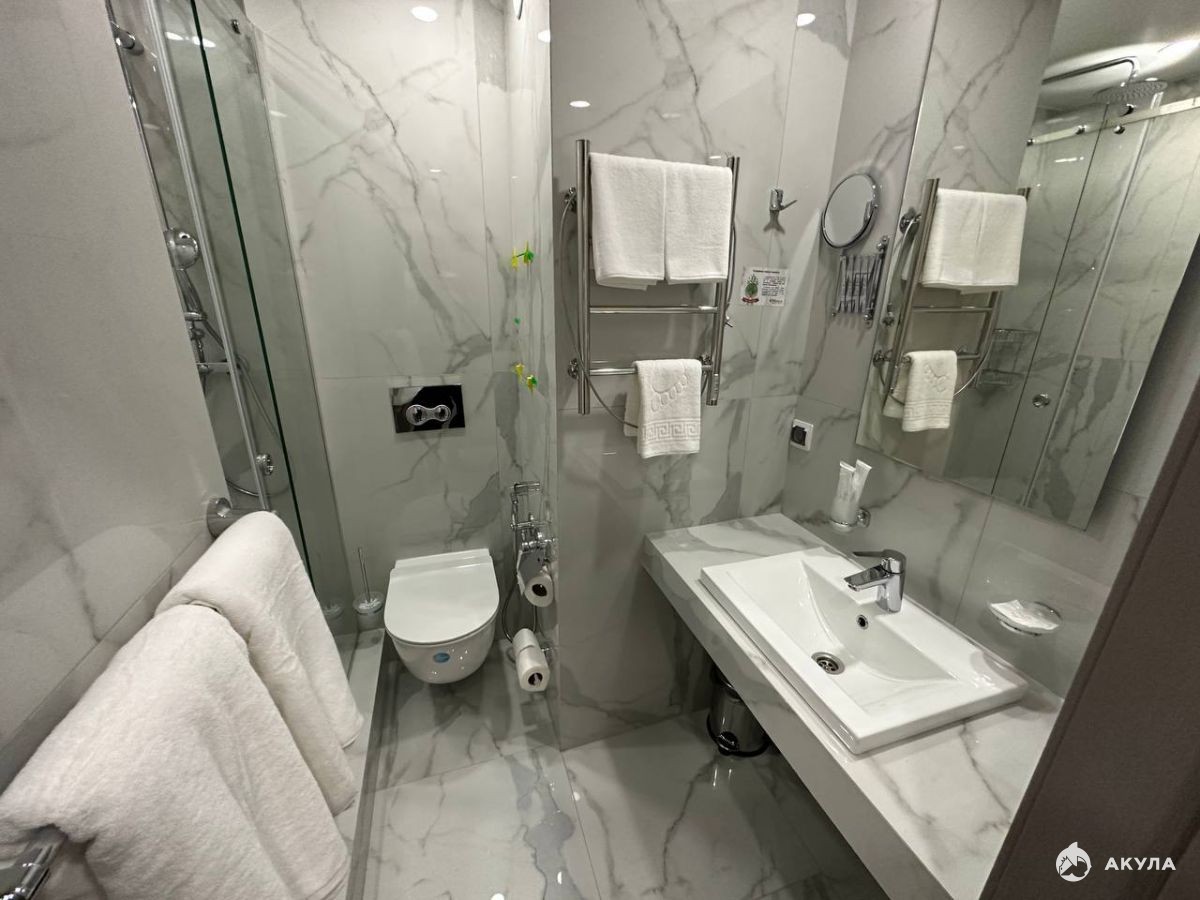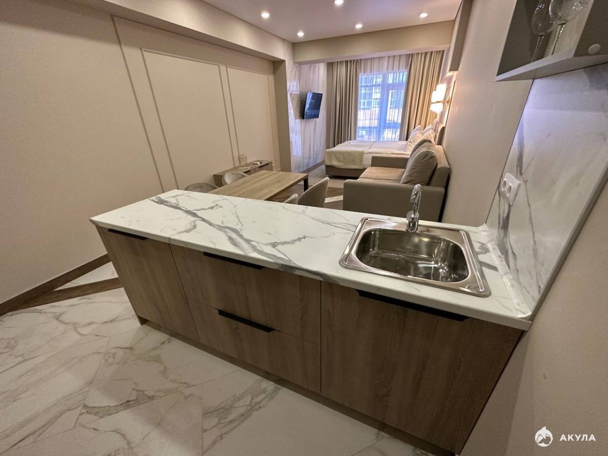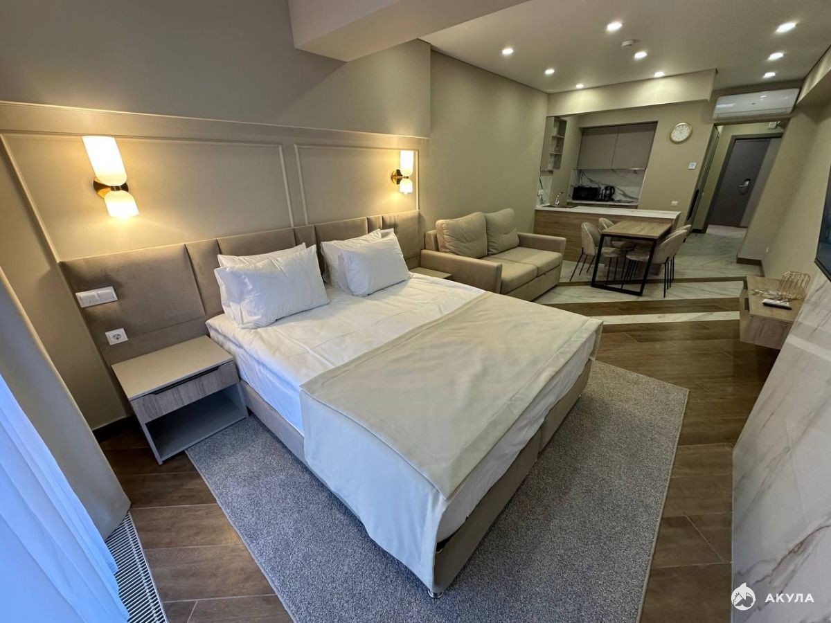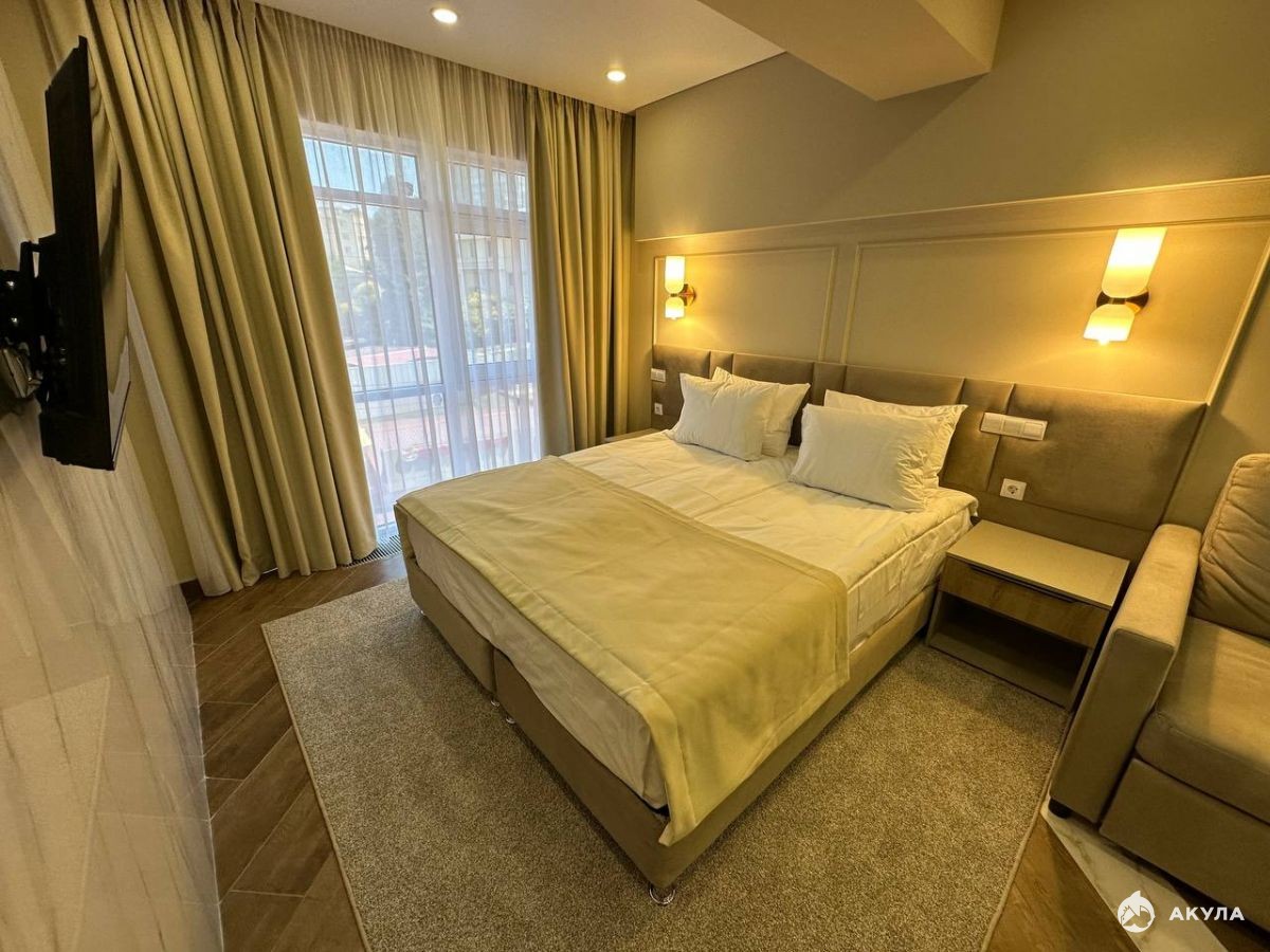 Номер укомплектован стильной мебелью, бытовой техникой, текстилем. Все продумано до мелочей для приятного и комфортного отдыха.