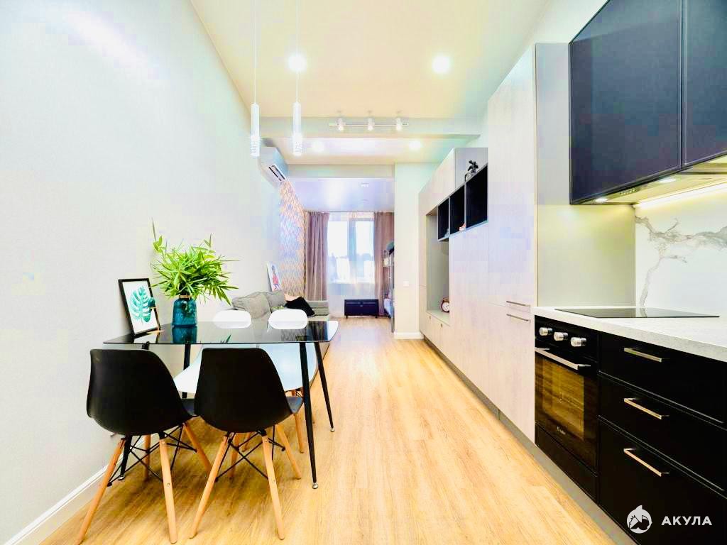 Дизайнерский ремонт, качественная мебель и техника. Панорамные окна открывают виды на горы и город.