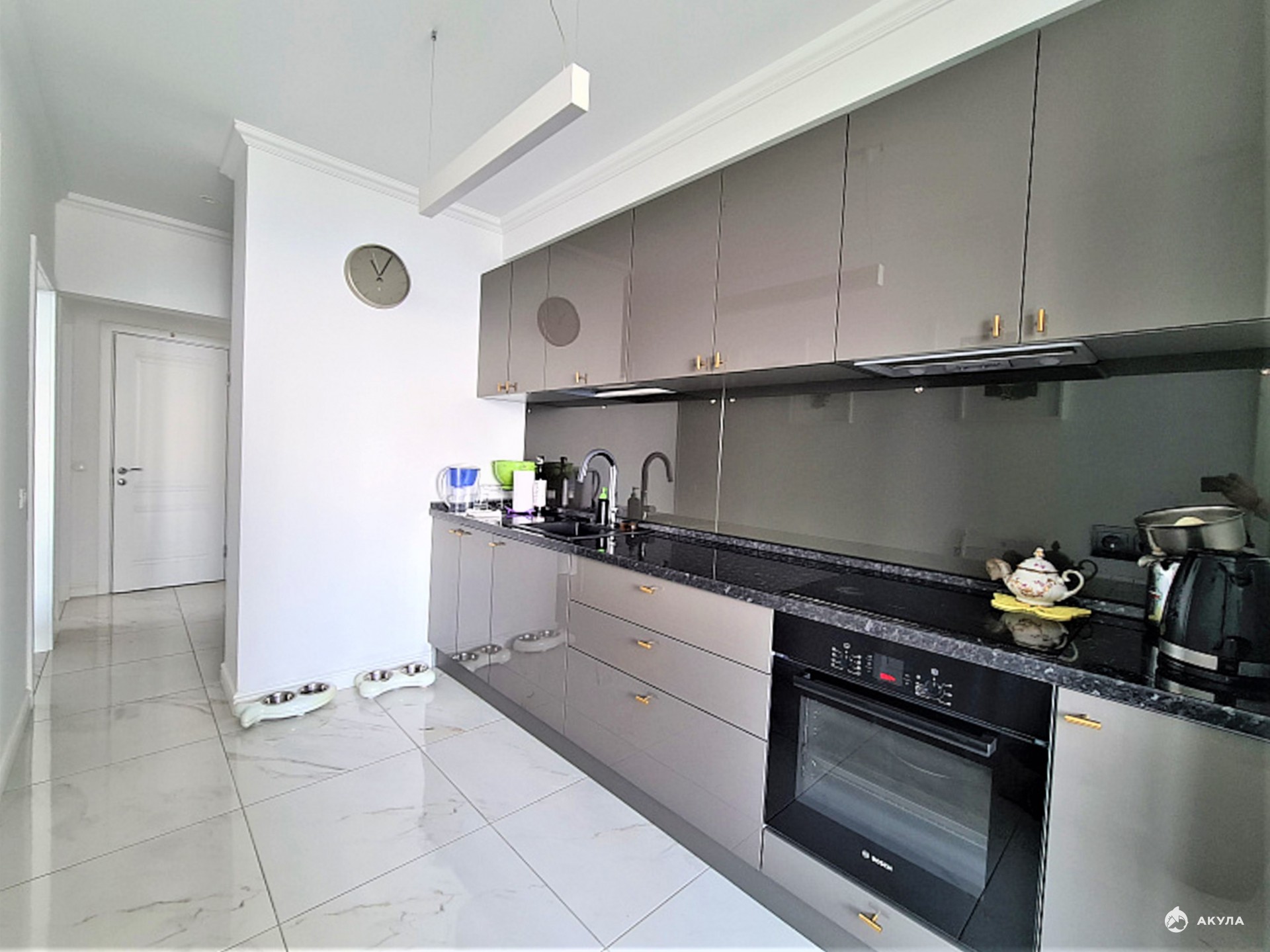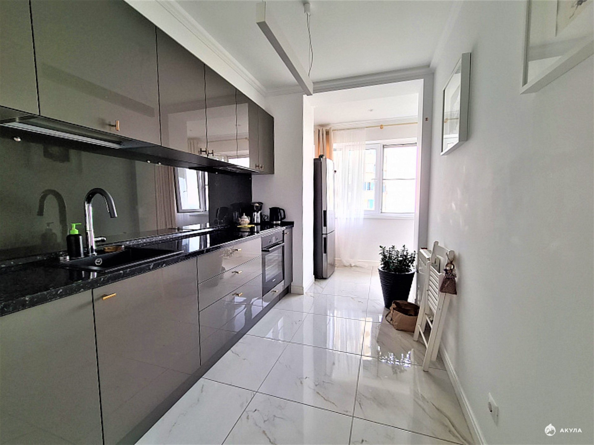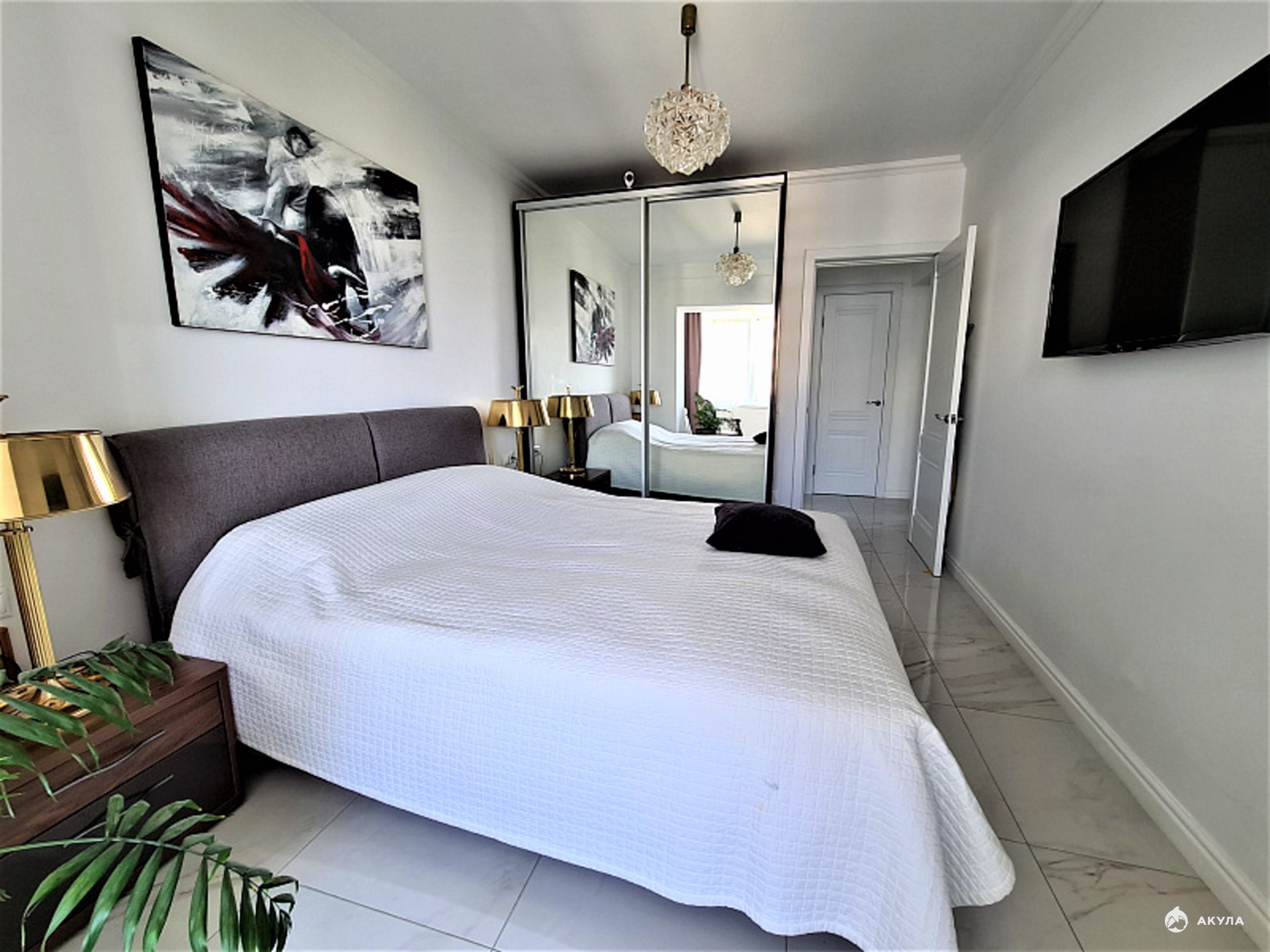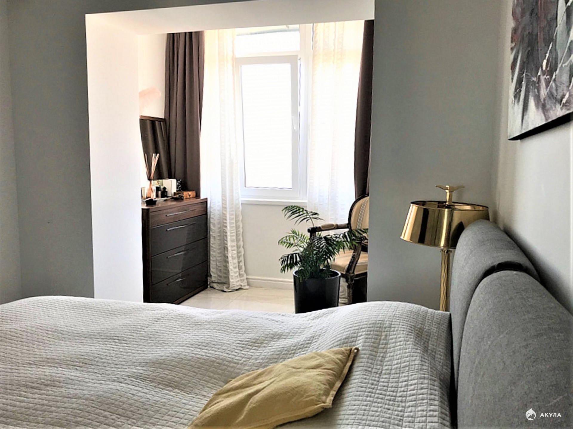 Площадь 60м2. Планировка квартиры: кухня, спальная комната с кабинетом, гостиная с жилой лоджией, гардеробная зона и совмещенный с/у. Выполнен дизайнерский ремонт, установлена новая мебель и техника.