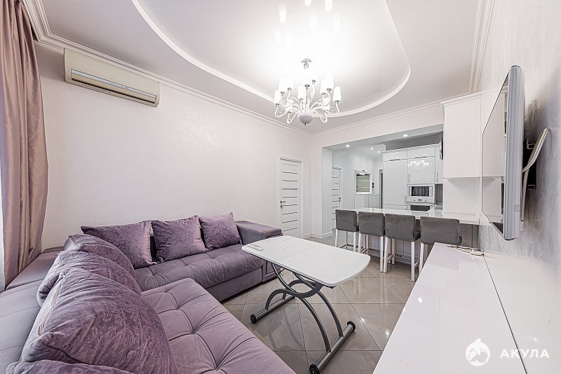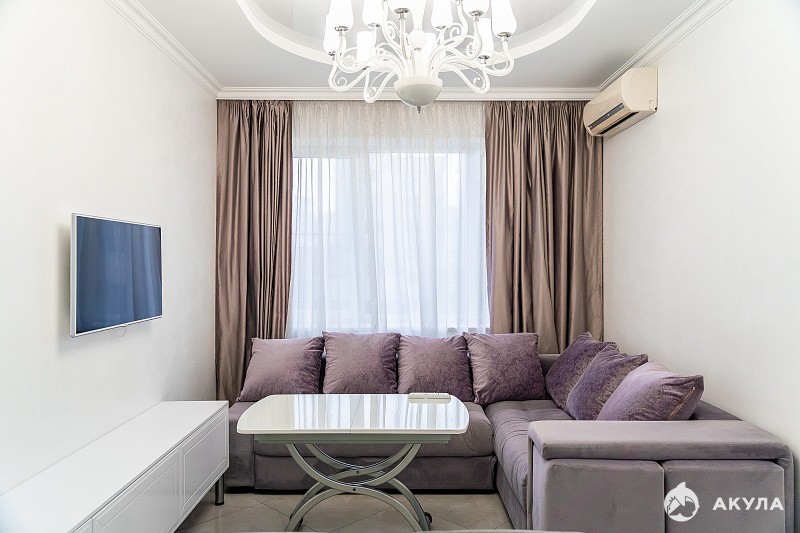 Квартира правильной планировки - просторная кухня-гостиная и 2 отдельные спальни! Панорамное остекление, высокие потолки, приятный вид на зелень и море! Есть вся необходимая мебель и техника, которая остается будущим собственникам.