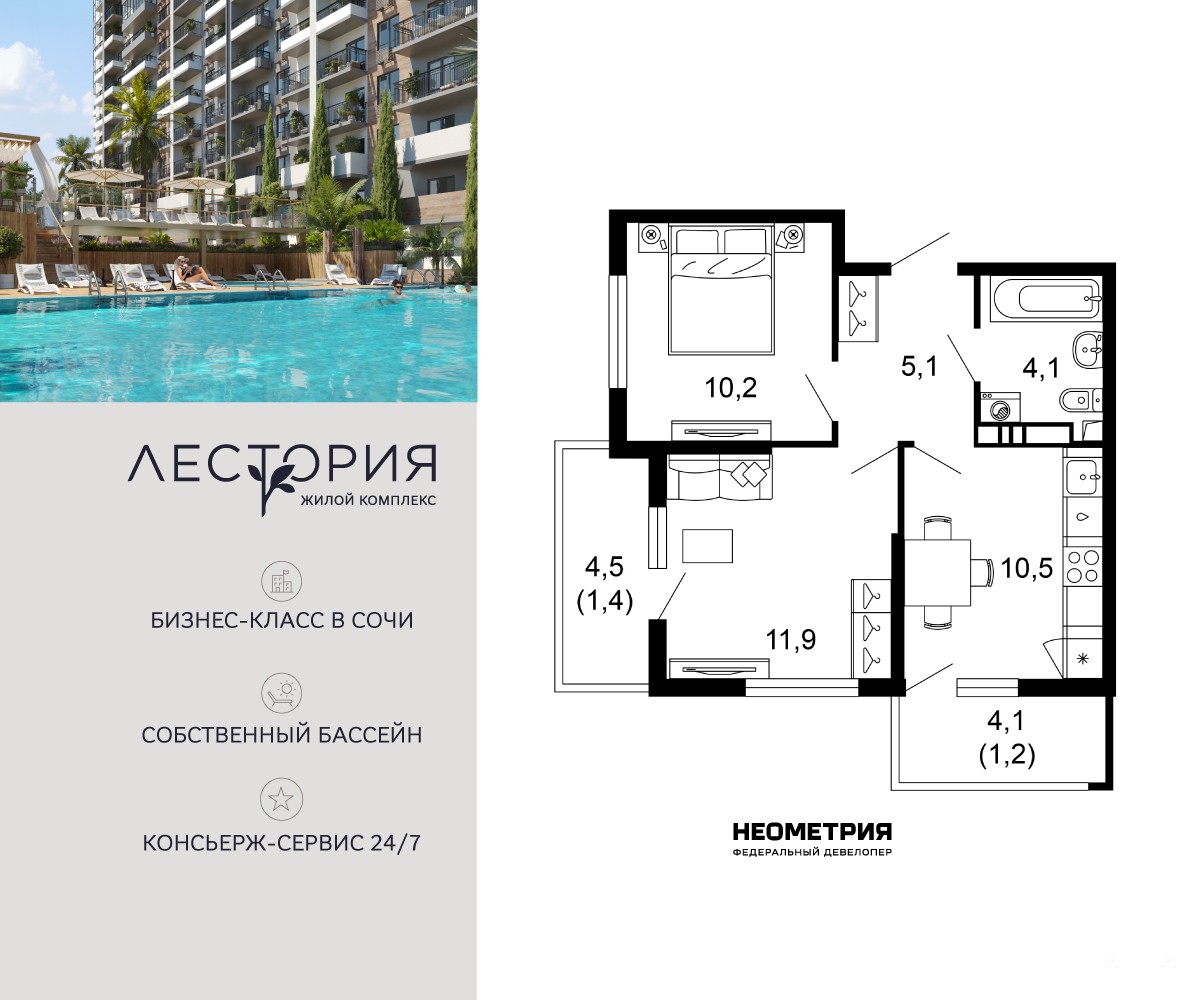 Продается квартира в жилом комплексе бизнес-класса «Лестория». В составе ЖК предусмотрена собственная аквазона площадью 473 квадратных метра с двумя подогреваемыми бассейнами, что соответствуют стандартам бизнес-класса.