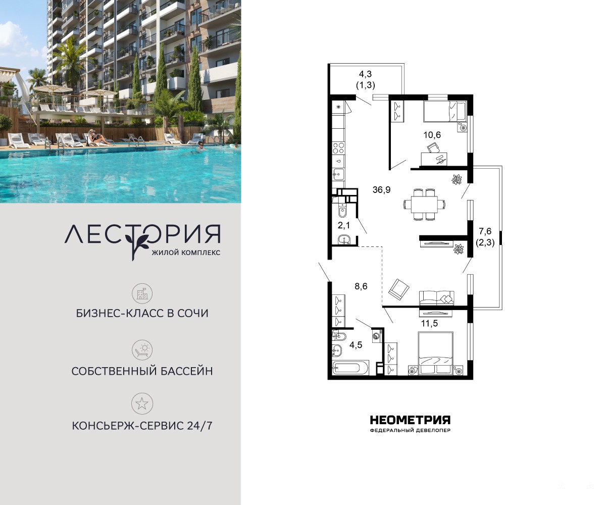 Продается квартира в жилом комплексе бизнес-класса «Лестория». В составе ЖК предусмотрена собственная аквазона площадью 473 квадратных метра с двумя подогреваемыми бассейнами, что соответствуют стандартам бизнес-класса.