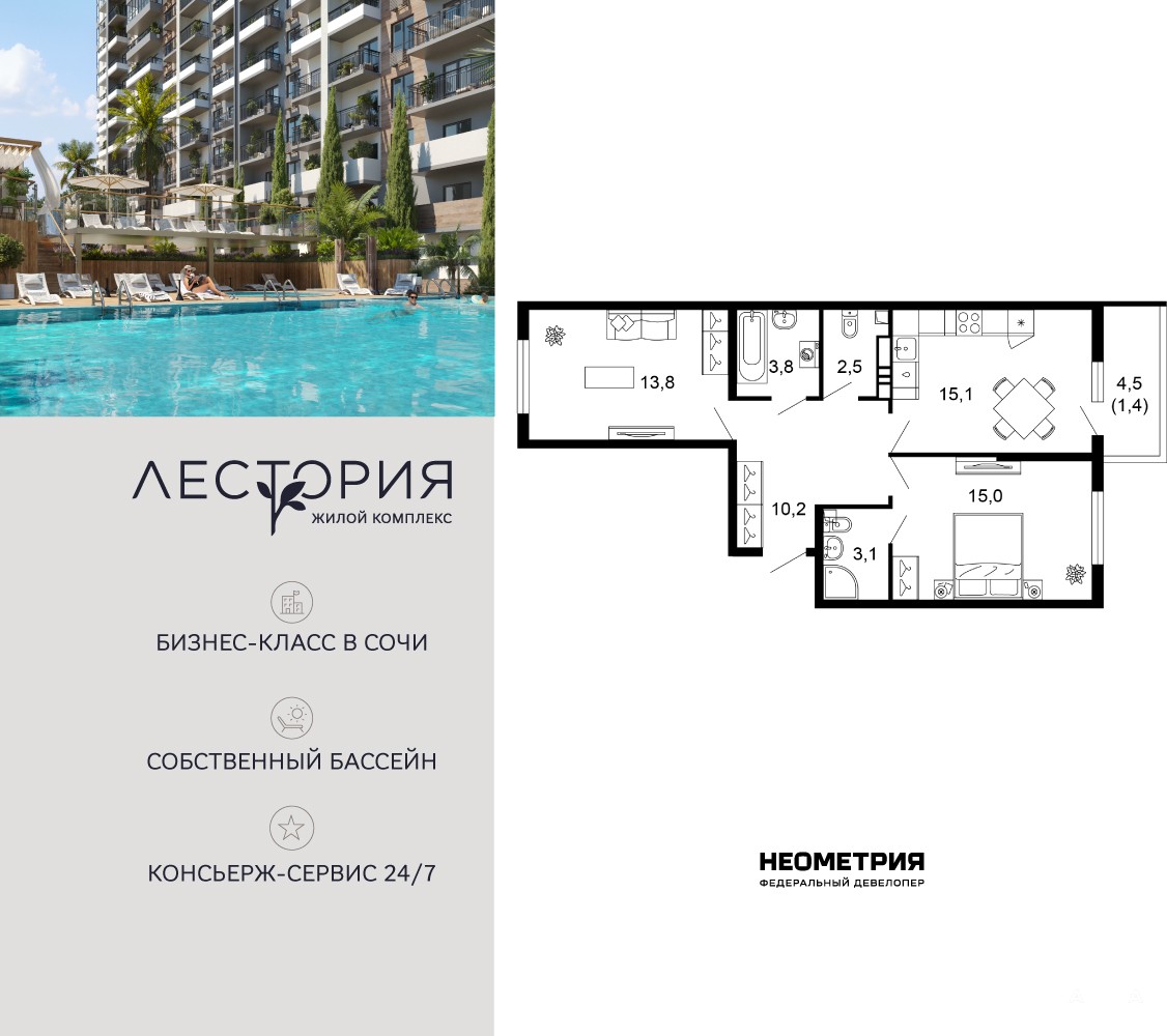 Продается квартира в жилом комплексе бизнес-класса «Лестория». В составе ЖК предусмотрена собственная аквазона площадью 473 квадратных метра с двумя подогреваемыми бассейнами, что соответствуют стандартам бизнес-класса.