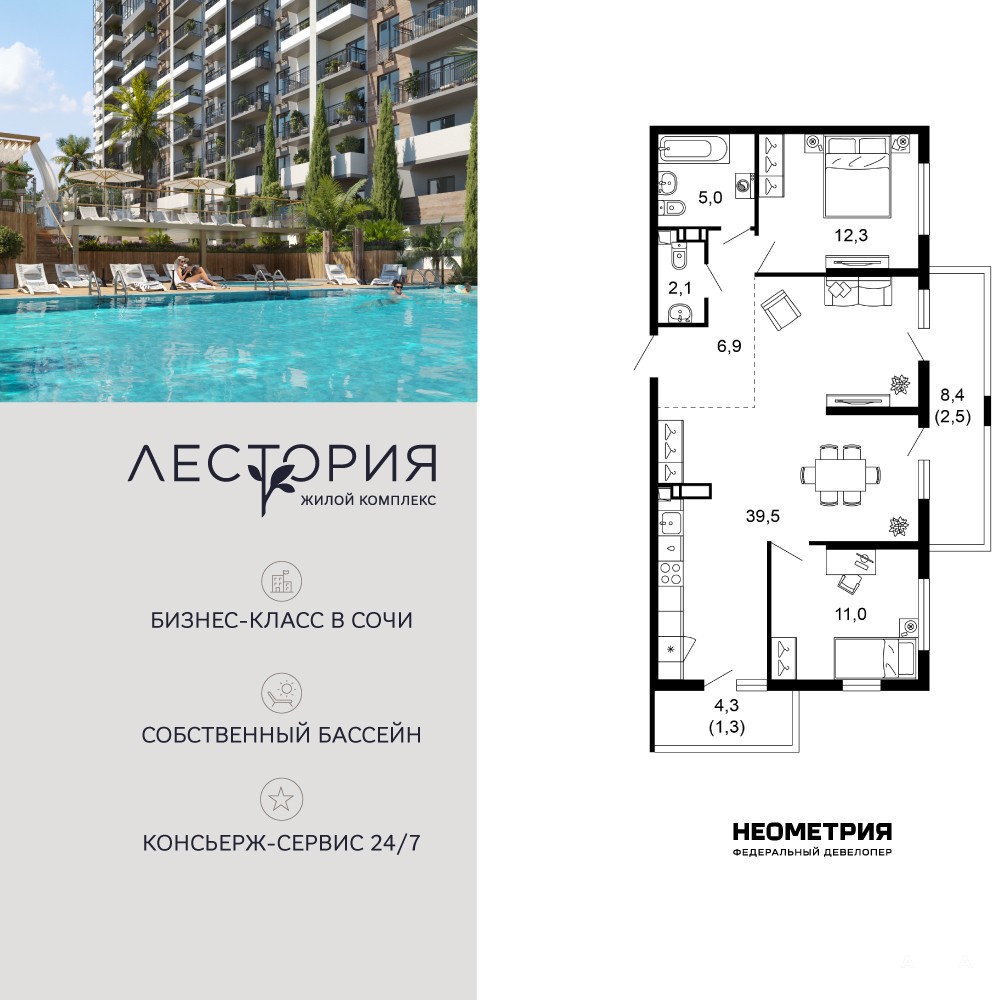 Продается квартира в жилом комплексе бизнес-класса «Лестория». В составе ЖК предусмотрена собственная аквазона площадью 473 квадратных метра с двумя подогреваемыми бассейнами, что соответствуют стандартам бизнес-класса.