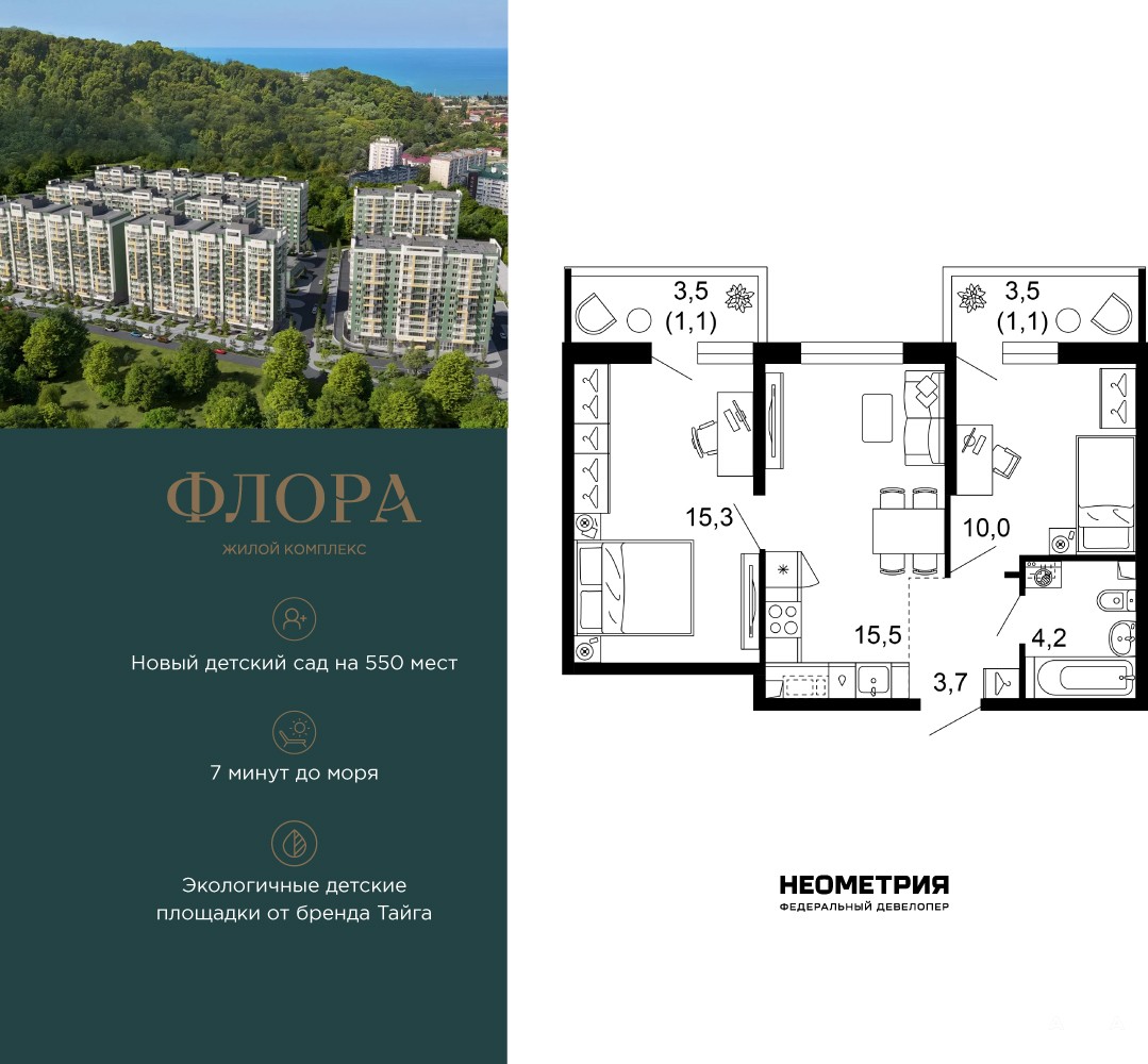 Продается квартира в ЖК «Флора» от федерального девелопера «Неометрия». Это жилой комплекс комфорт-класса в самом зеленом районе Сочи. При проектировании постарались максимально сохранить окружающую флору и фауну. Теплое море, горы, целебные источники, река, близость заповедника – все это уже рядом с вами.