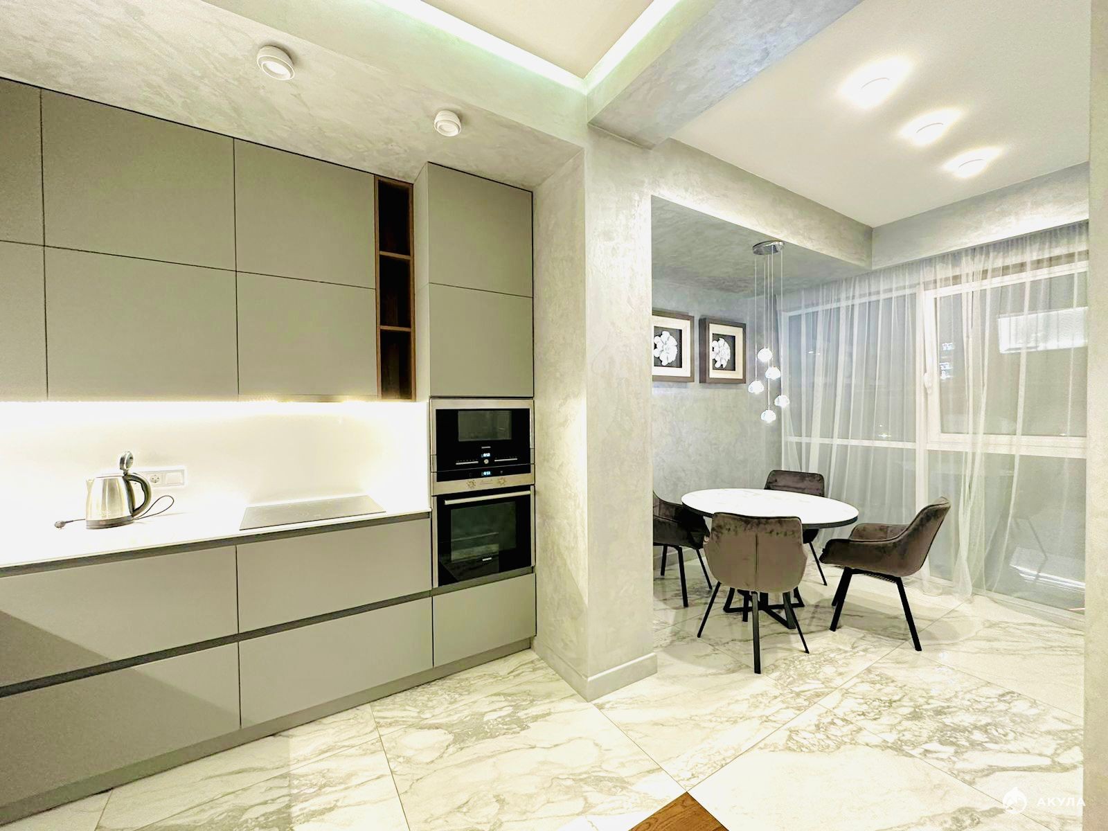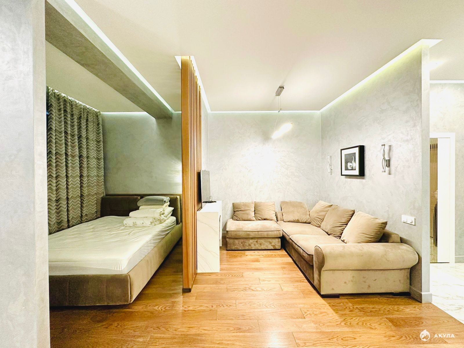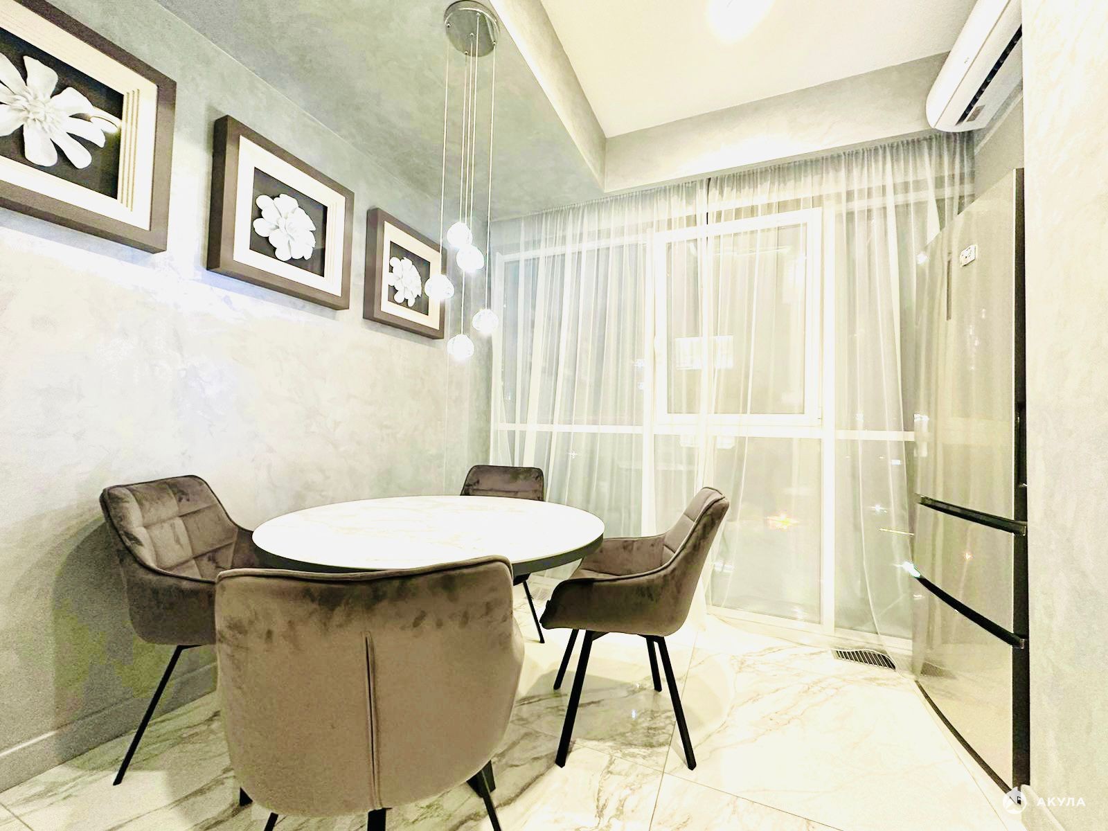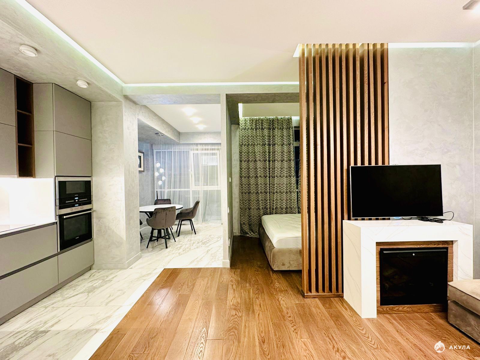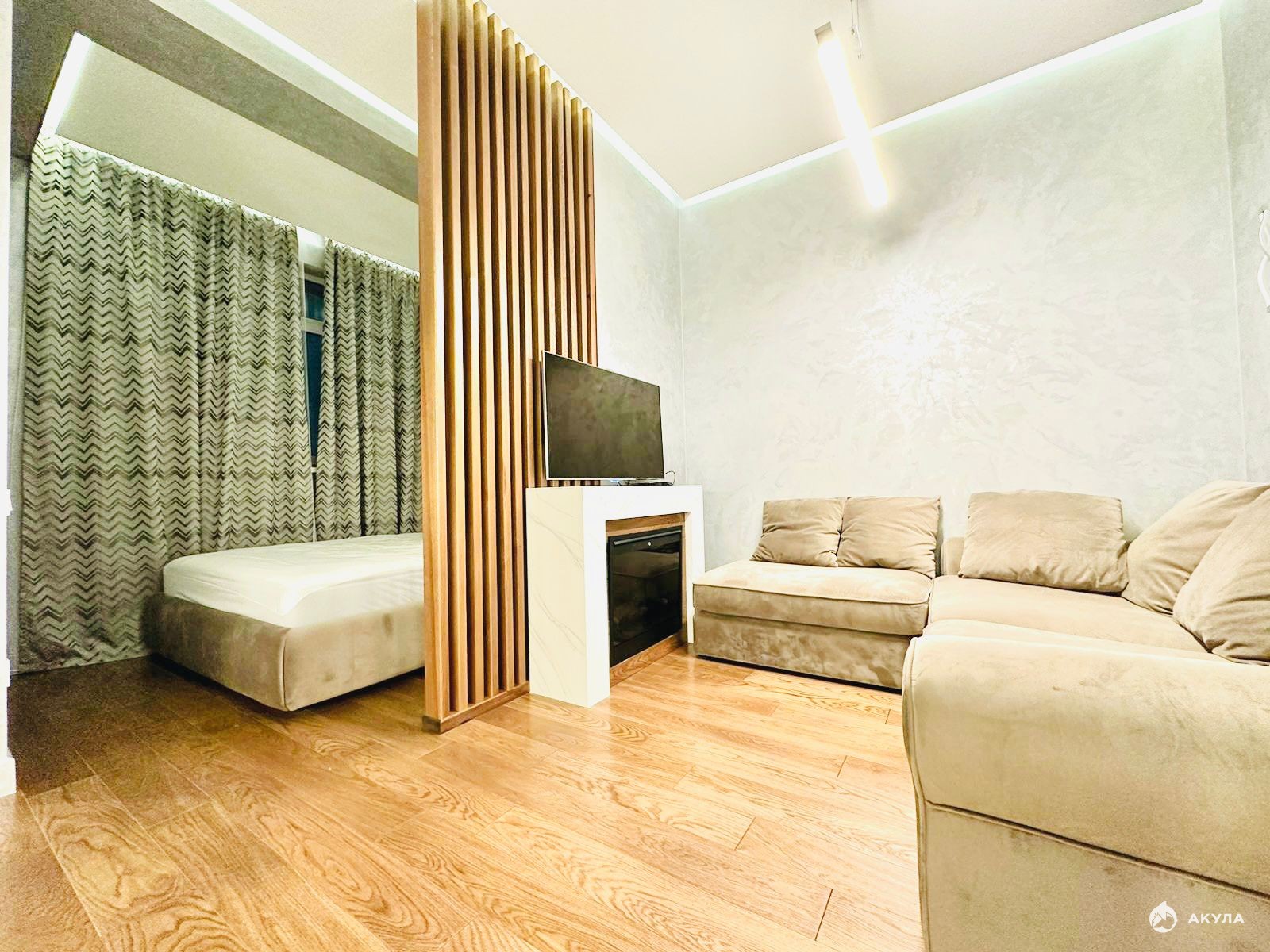 В квартире сделан новый ремонт, стоит качественная мебель. Большая кухня, гостинная, отделена спальная зона, комнаты не изолированы. Чистый воздух, прекрасный вид и пляж под окнами дома.