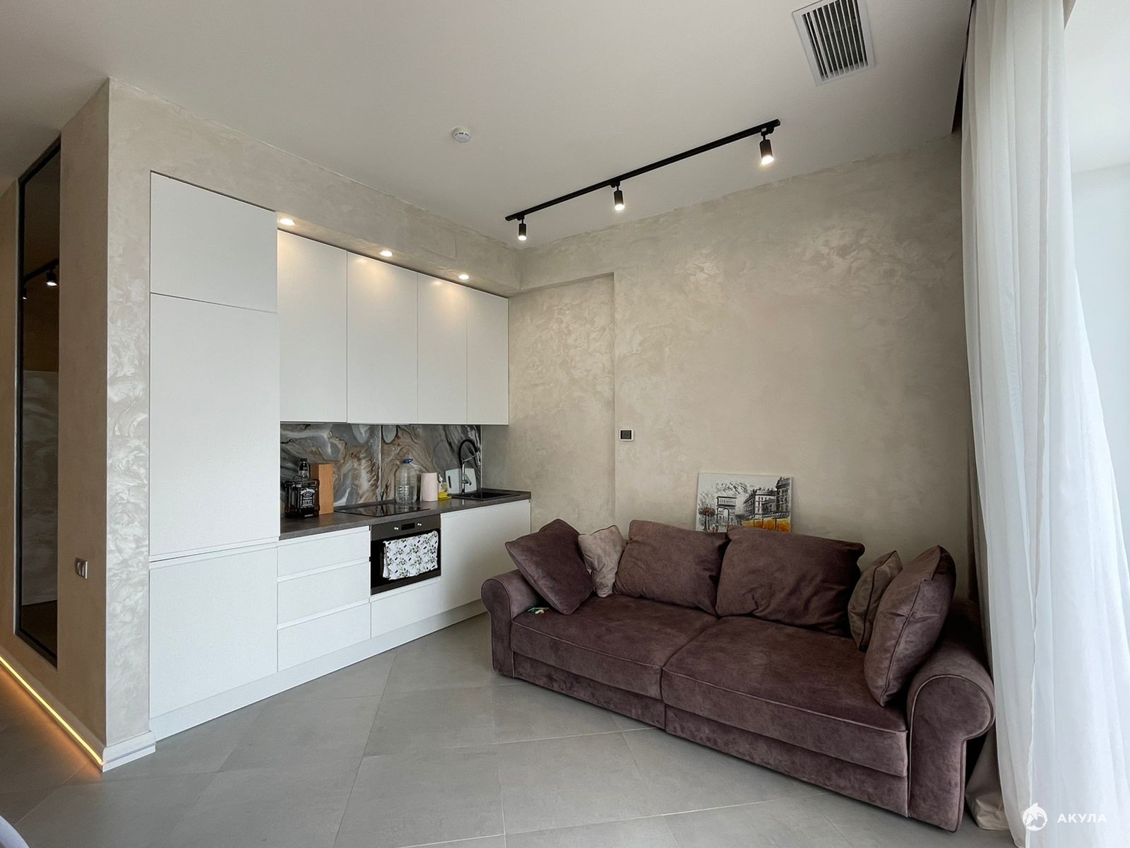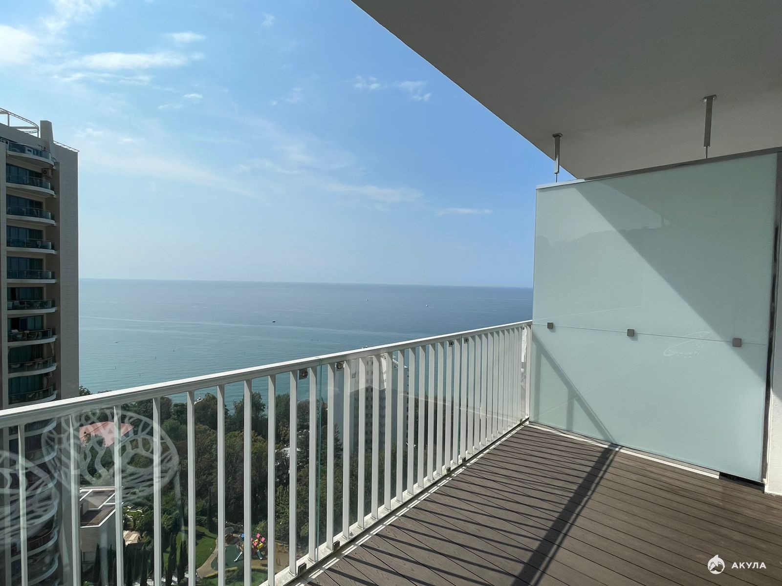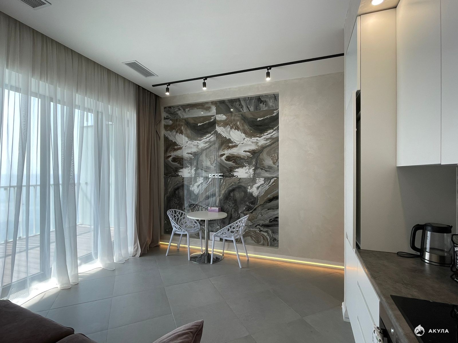 50 метров. Спланирована: Изолированная спальня, кухня-гостинная, холл, санузел и гардеробная. Квартира с качественным дизайнерским ремонтом. Никто не жил. Есть большая терраса. Прямой вид на море!