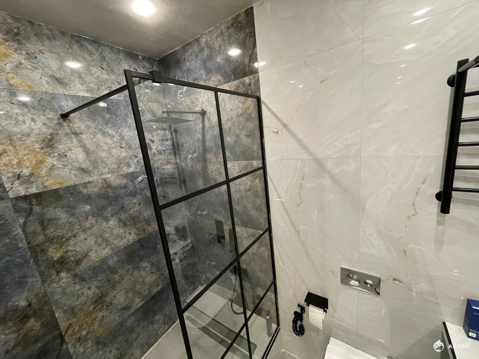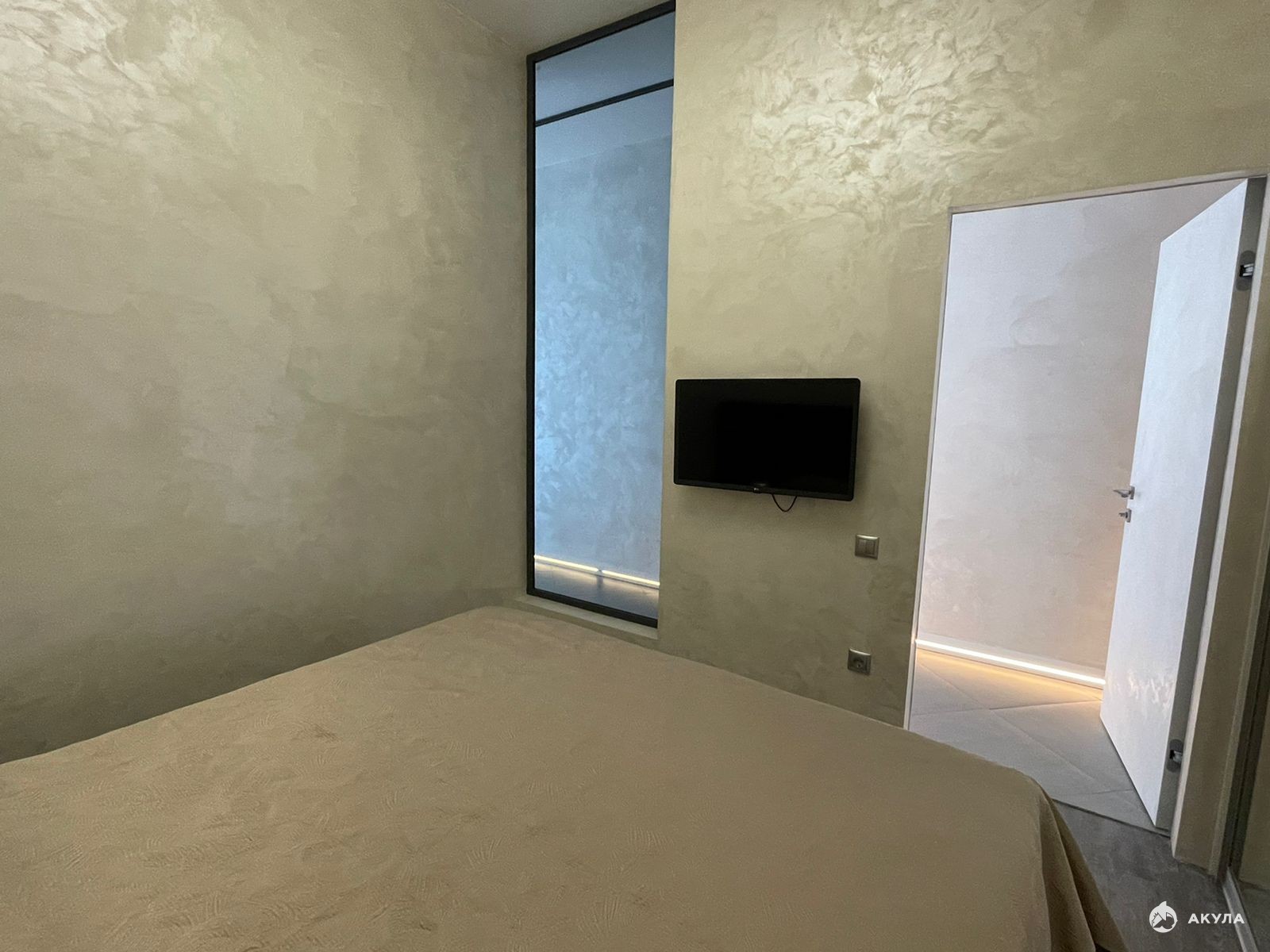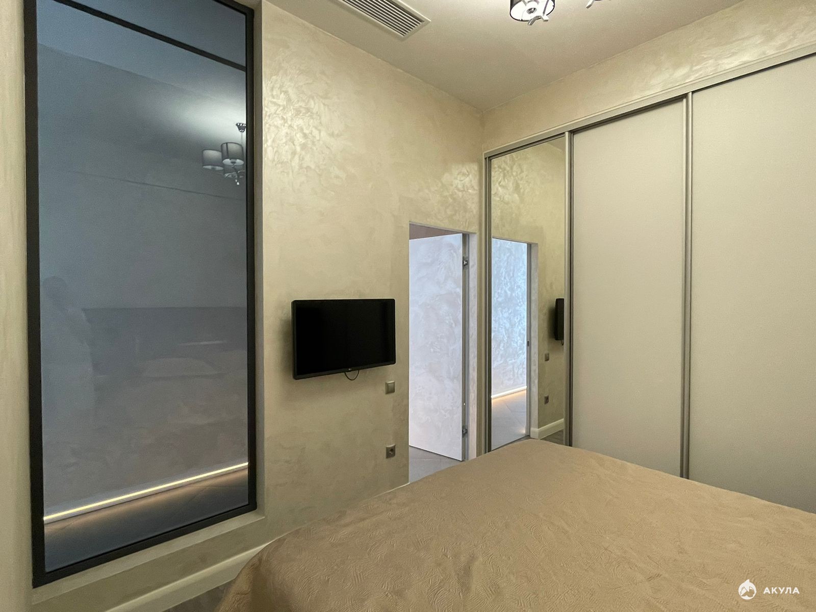 50 метров. Спланирована: Изолированная спальня, кухня-гостинная, холл, санузел и гардеробная. Квартира с качественным дизайнерским ремонтом. Никто не жил. Есть большая терраса. Прямой вид на море!