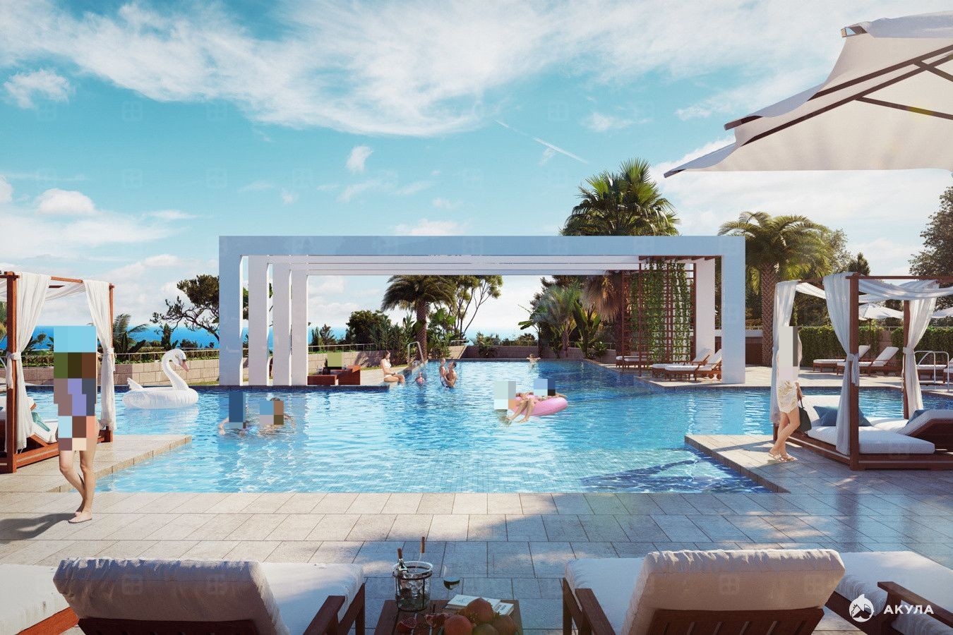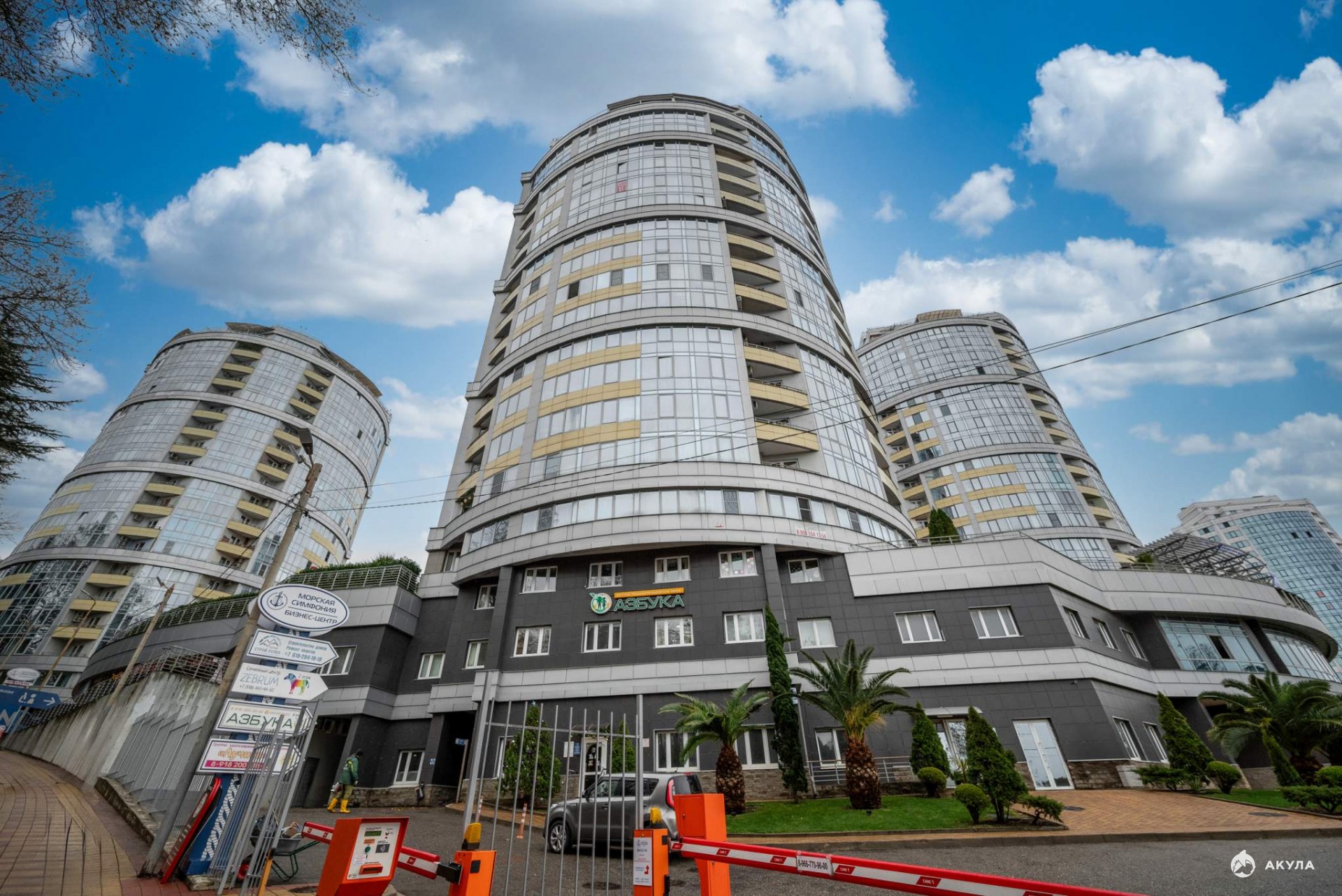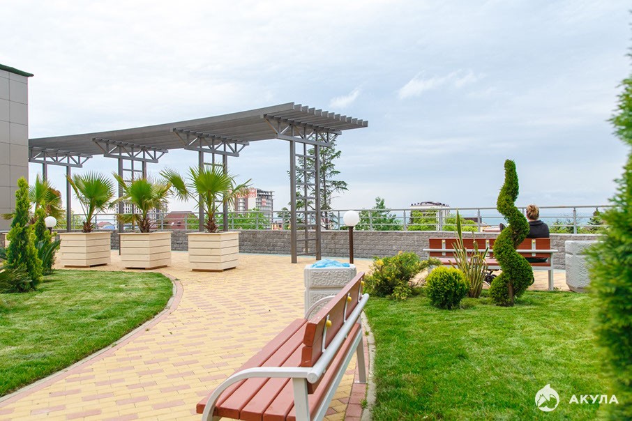 Большой закрытый жилой комплекс "Морская Симфония" с большим открытым бассейном, смотровой площадкой с видом на море, детские площадки, фонтан с подсветкой, теннисный корт, спортивные площадки, фитнес.