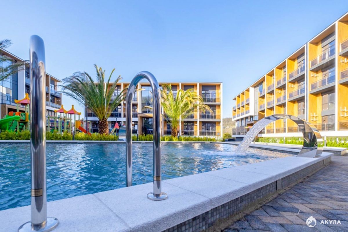 На территории комплекса оборудованы детские площадки, футбольное поле, фитнес-центр, столовая, зоны отдыха, бассейн с мини-баром, закрытая частная территория, паркинг, вид комплекса на зеленый массив.