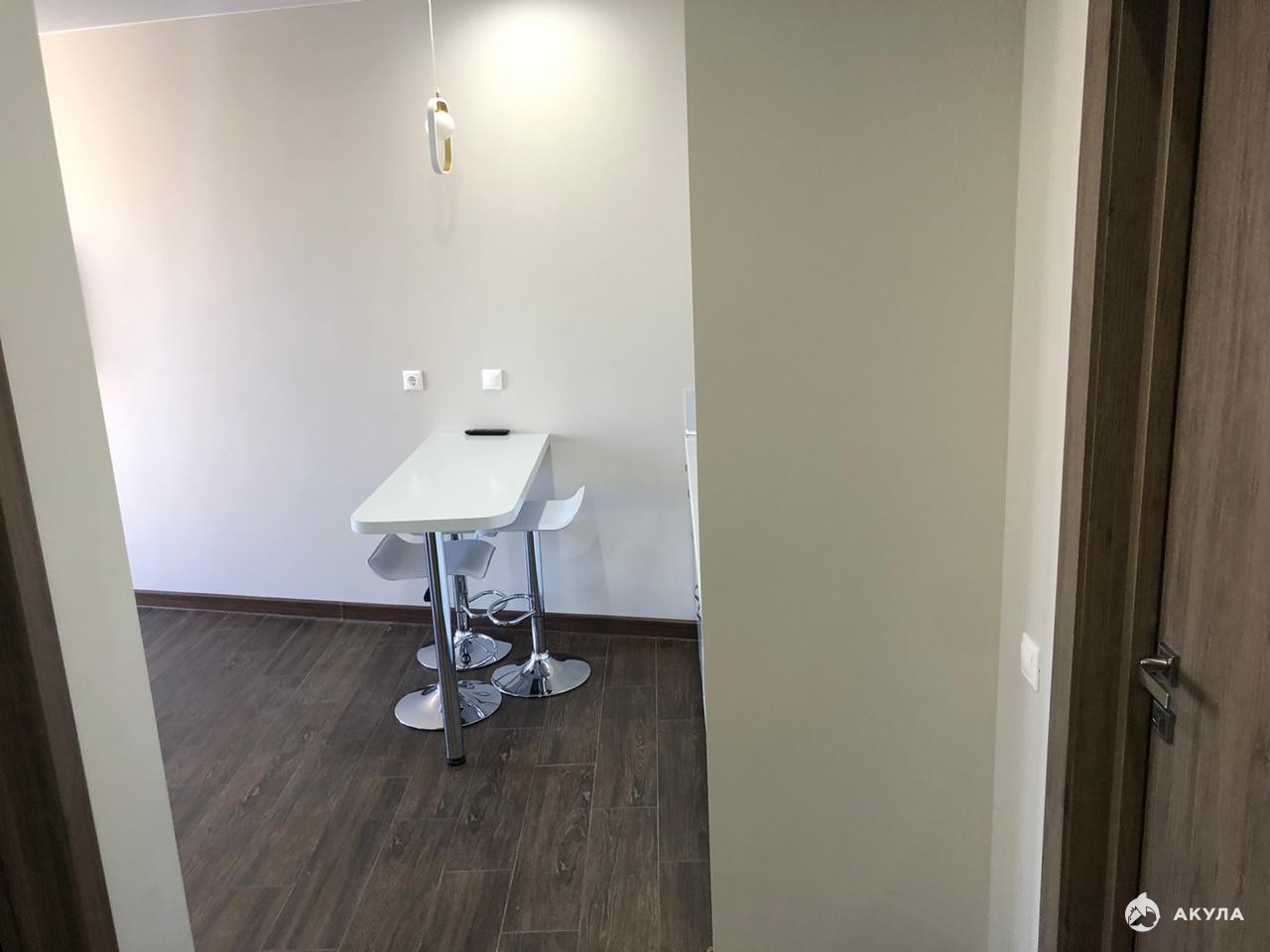 установлена мебель шкаф купе, кровать с матрацем, кухонный гарнитур, барная стойка, стулья, оборудованная прихожая,