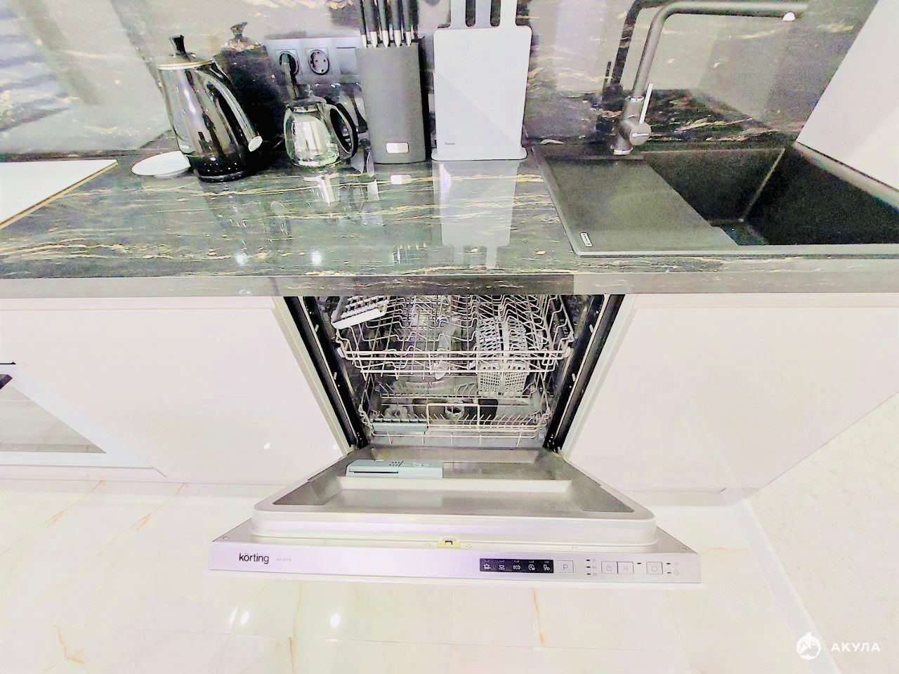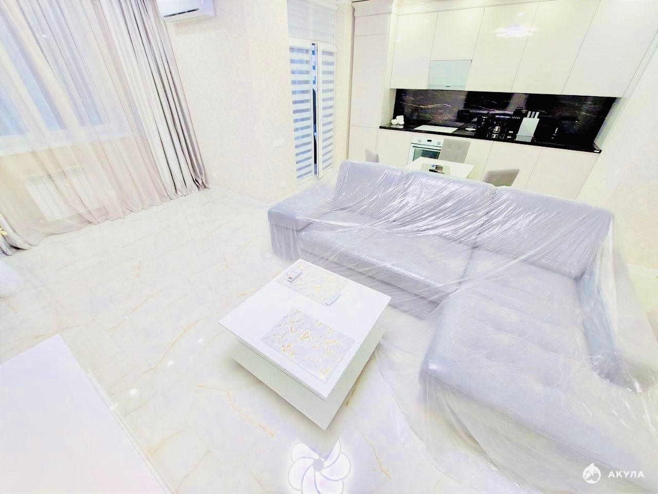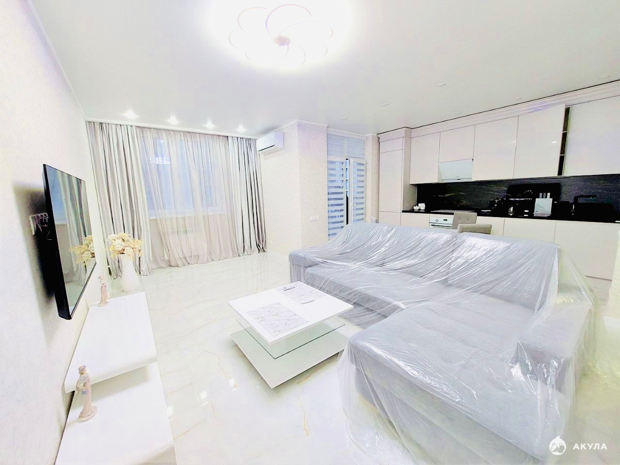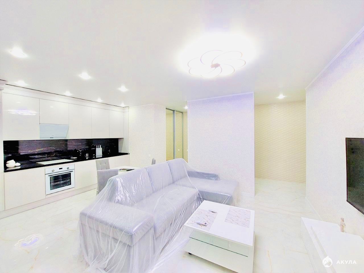 Общая площадь квартиры 65м2, из них просторная кухня гостиная с продуманной зоной готовки и обеденной зоной, зона тв, с панорамным остеклением и выходом на балкон, полностью укомплектована мебелью и техникой именитых брендов, большой, две изолированные спальные комнаты, совмещенный санузел, ремонт выполнен в квартире в спокойных тонах.