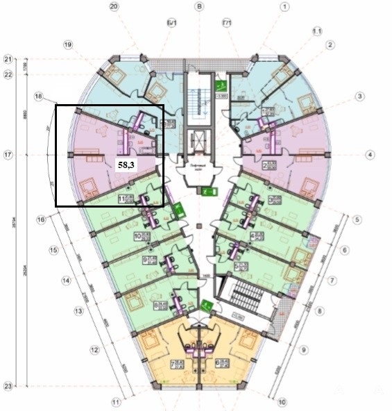 В здании - два подъезда. По конструктивной схеме - монолитное железобетонное. Квартира представлена без ремонта, свободной планировки. Подведены все коммуникации, центральное отопление. В квартире устанавливаются электроплиты. Имеется балкон.