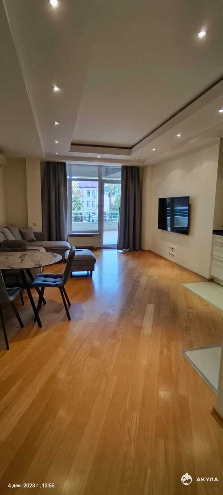 Арт. 83116455. Эта квартира в Сочи представляет собой идеальное сочетание современного дизайна и комфорта. В просторной гостиной выделяется стильный угловой диван, который создает уютную обстановку для отдыха. Рядом с диваном расположена круглая обеденная группа, что позволяет легко собираться с друзьями или проводить уютные семейные ужины.