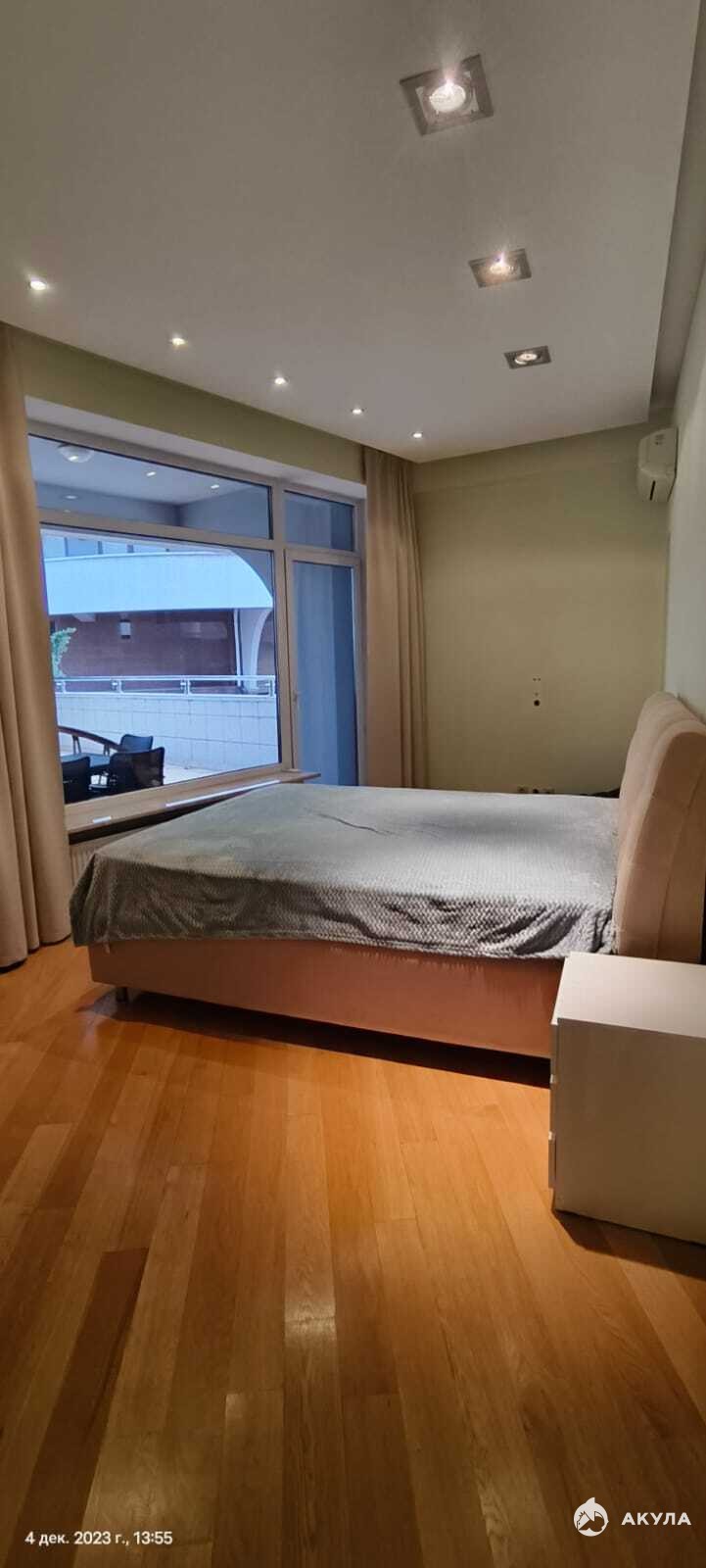 Уютная атмосфера дополнена повышенным уровнем естественного освещения благодаря большим окнам, оформленным элегантными шторами. На стене установлен современный телевизор, что добавляет функциональности и способствует расслабляющему времяпрепровождению.
