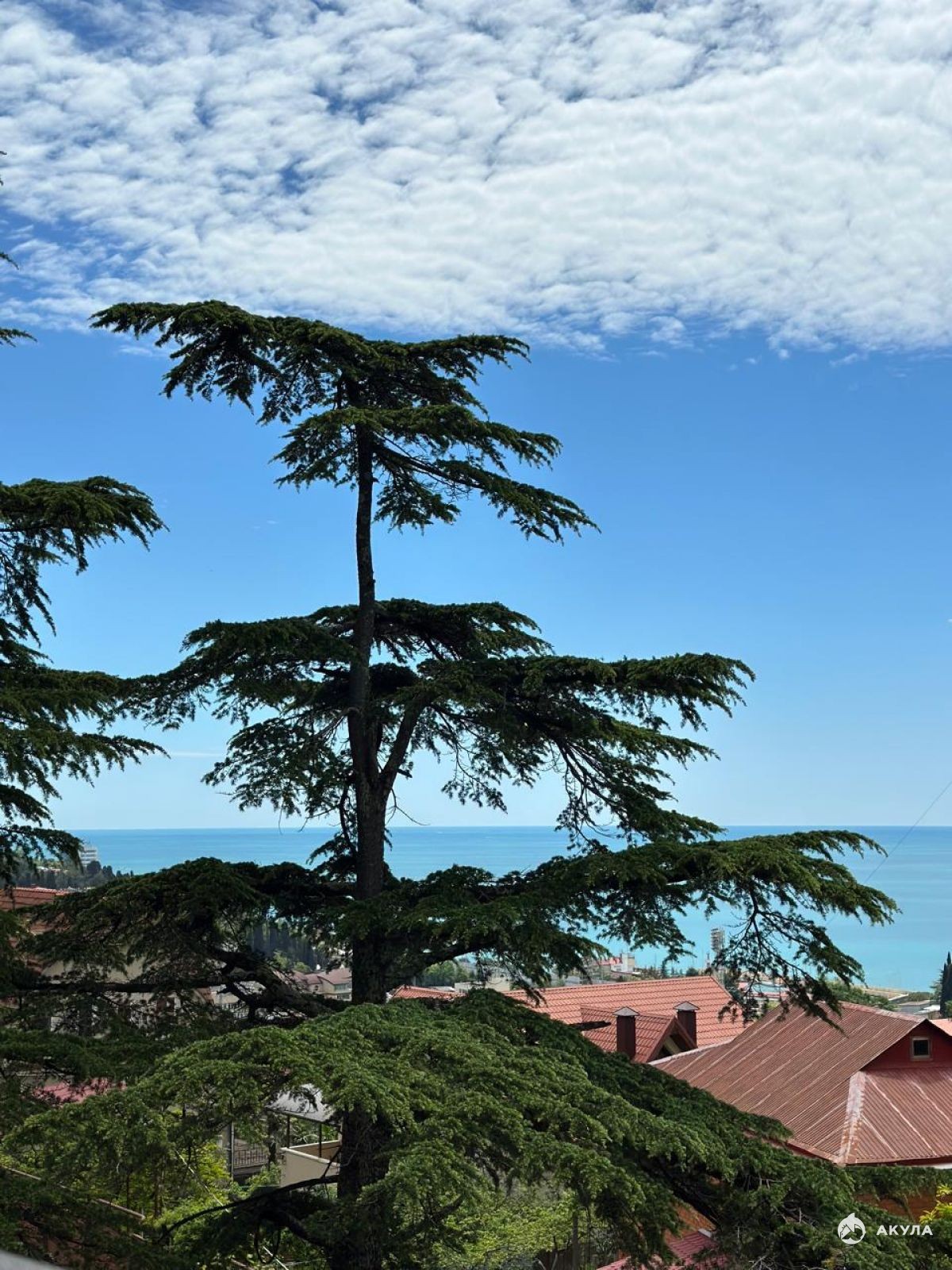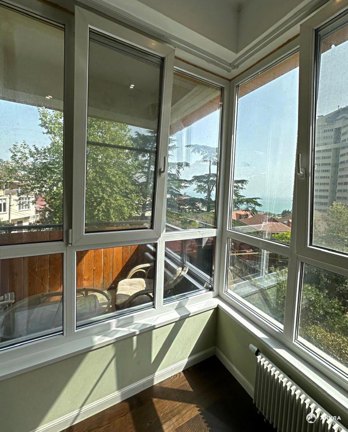 Панорамные окна по всей площади квартиры с видом на море, город и зелень.