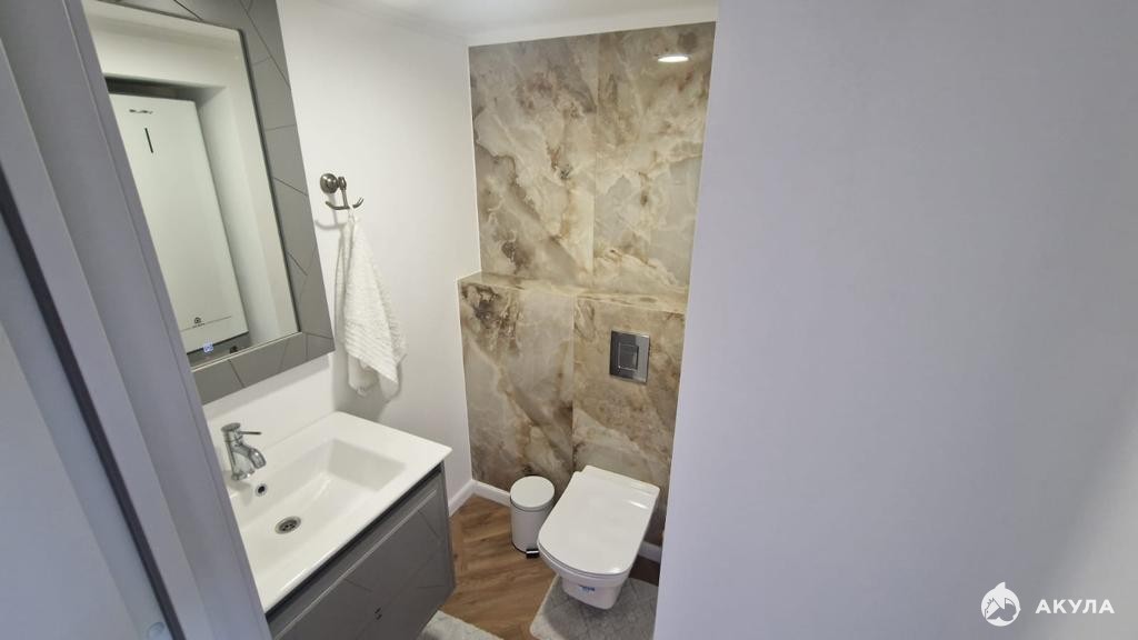 Первый этаж: кухня-гостиная, санузел. На втором этаже спальня санузел. Апартаменты с новой мебелью. На кухне встроенный холодильник, духовка, посудомоечная машина, вытяжка, плита. В спальне установлен кондиционер, кровать, раскладной диван, тумба и письменный стол. Дорогой текстиль, шторы блэкаут.