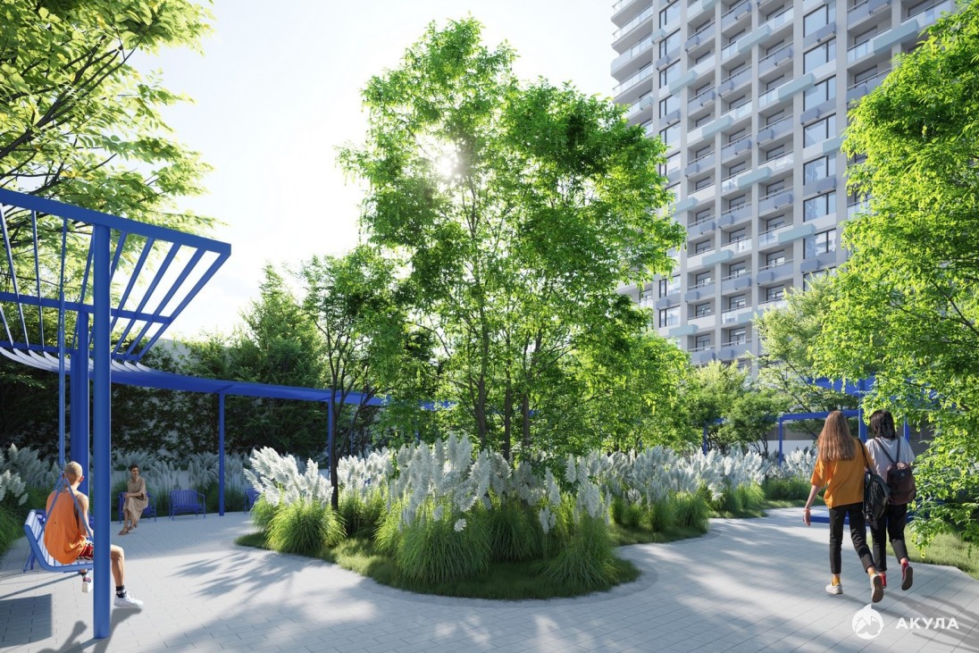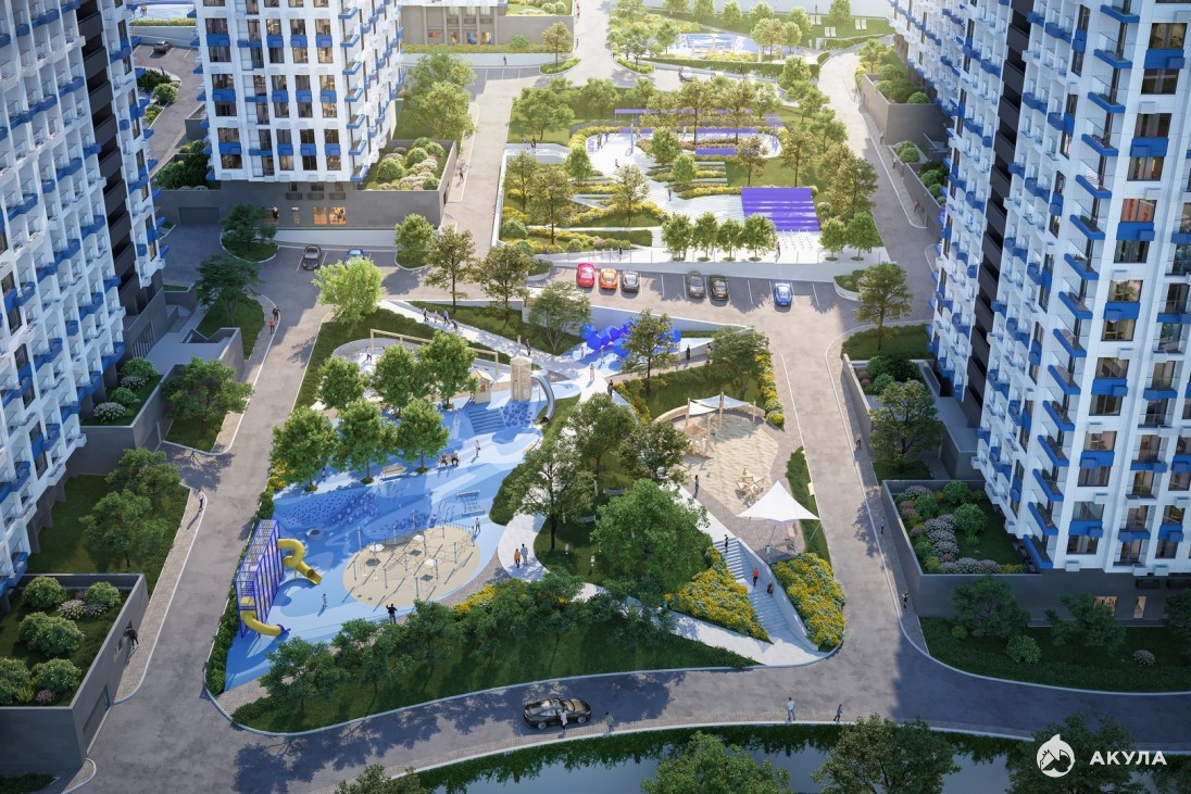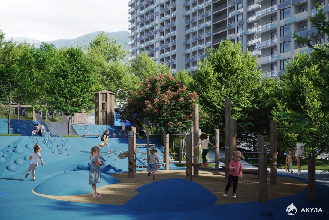 Благоустройство прилагающей территории включает в себя строительство детской и спортивной площадки, а также гостевой автостоянки.