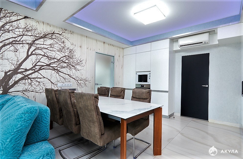 Удобная планировка! Спальня, просторная кухня, гостиная, гардеробная. Панорамные окна выходят на южную часть города. Вода, электричество, центральное отопление, теплые полы. Шикарный вид из всех окон. В квартире выполнен дорогой дизайнерский ремонт. Эксклюзивная встраиваемая бытовая техника, кондиционеры, мебель.