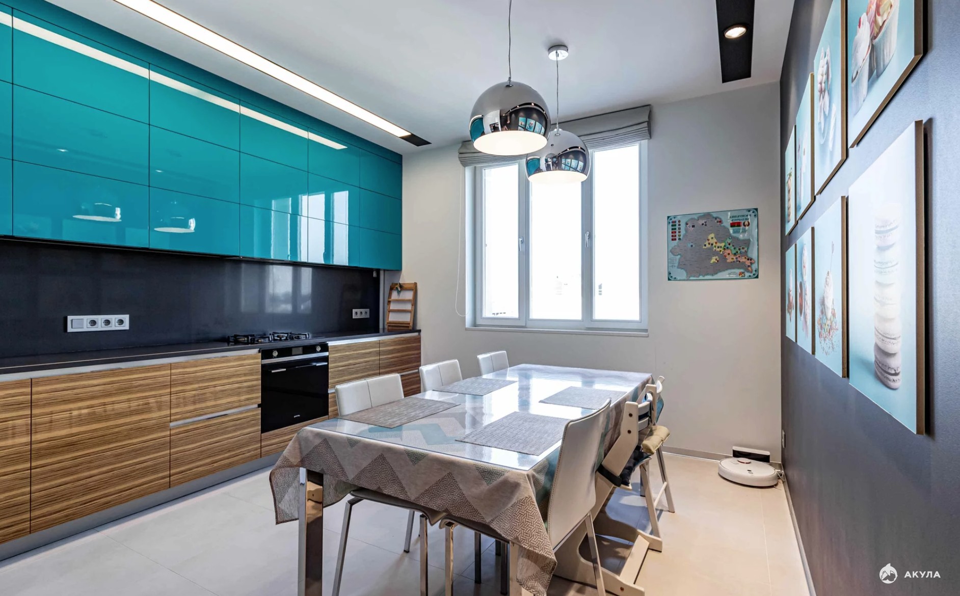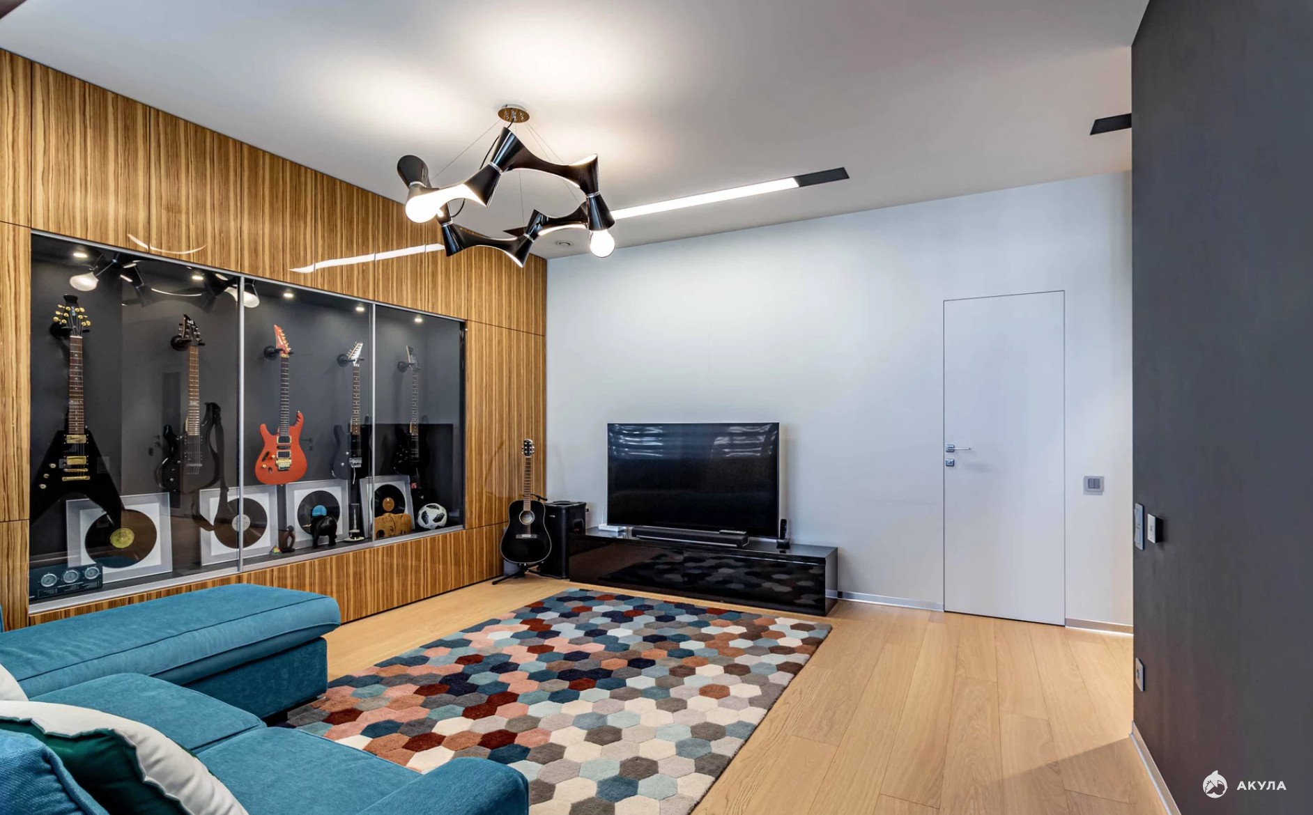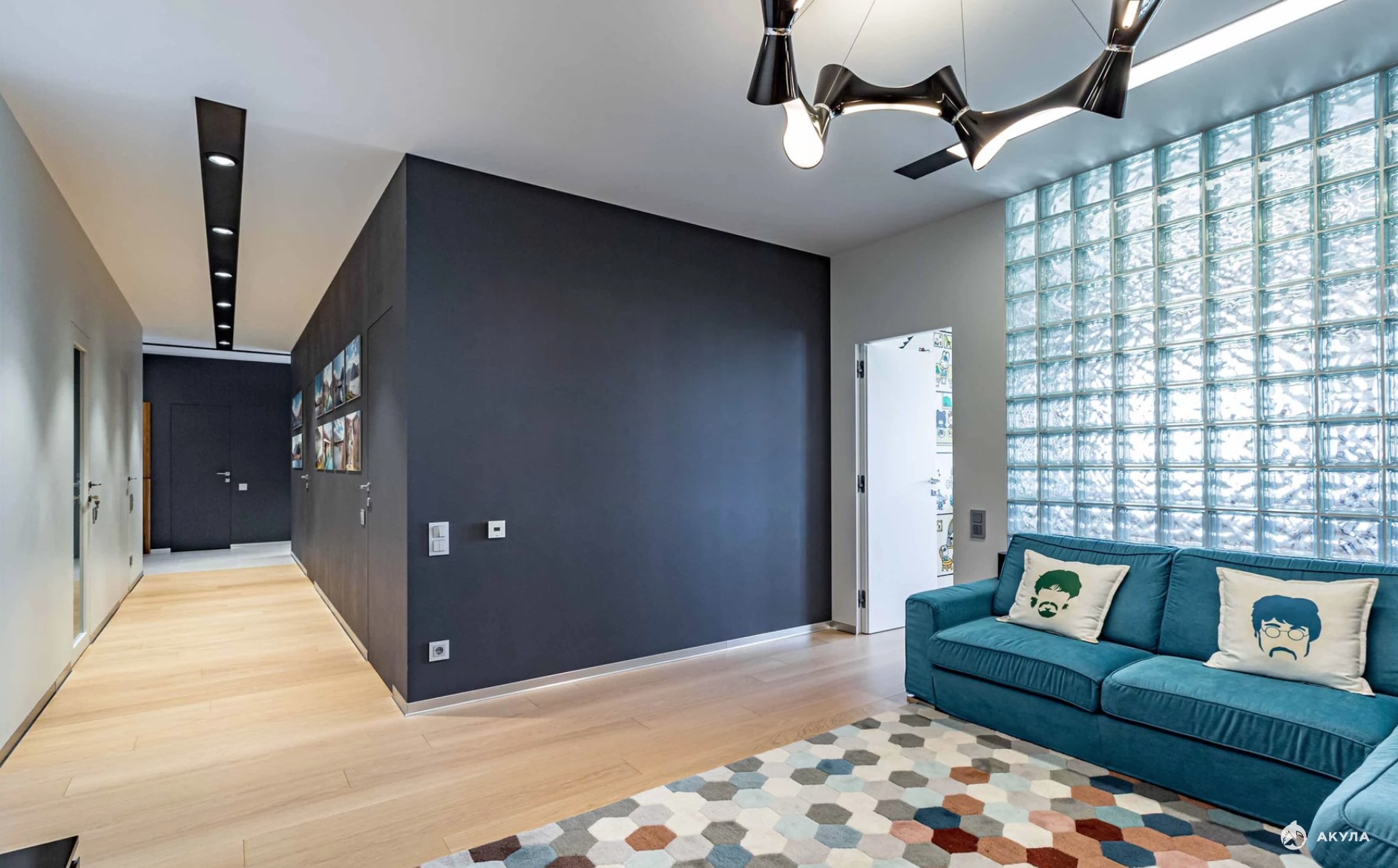 Квартира спланирована в полноценную трехкомнатную: изолированная гостиная, кухня, мастер-спальня со своей ванной и гардеробной комнатой, две детские комнаты - для мальчика и для девочки, второй санузел, кабинет. Ремонт выполнен в светлых натуральных оттенках с использованием акцентных пятен в виде декора. Ремонт делался для себя, использовались качественные материалы, дорогая мебель и техника, сантехника премиальных брендов.