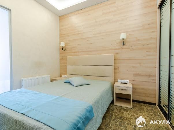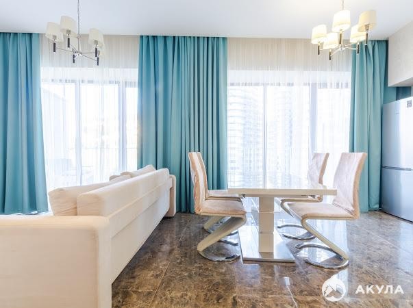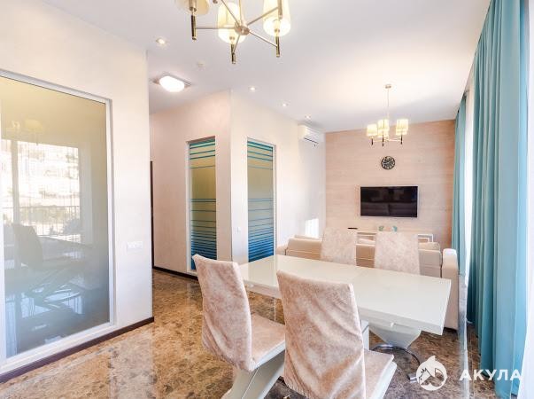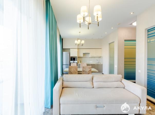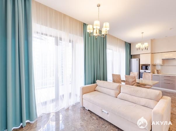 Апартамент состоит из трех спален, кухни-гостиной, двух совмещенных санузлов, гардеробной и террасы с шикарным видом на море.