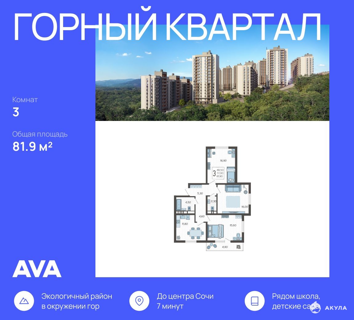 Продается 3-комнатная квартира в доме (Литер 2), срок сдачи : 3 кв. 2026, общей площадью 81.9 кв.м., на 9 этаже в новом современном жилом комплексе в Сочи «Горный квартал», Хостинский район. Отличный вариант для инвестиций и жизни.