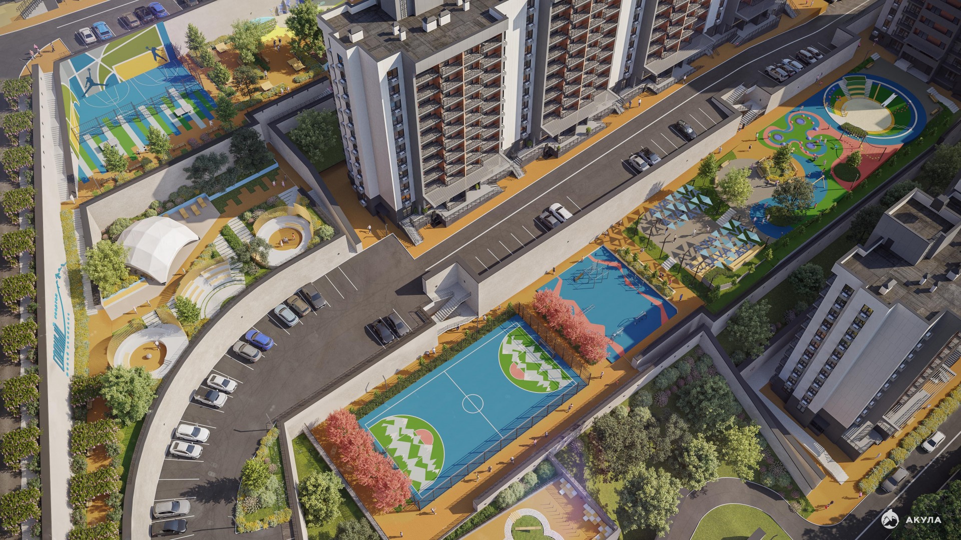 «Горный квартал» отличают великолепные закрытые дворы с современными детскими и спортивными площадками, беседками с навесами и гамаками, площадкой для йоги и кинотеатр под открытым небом.