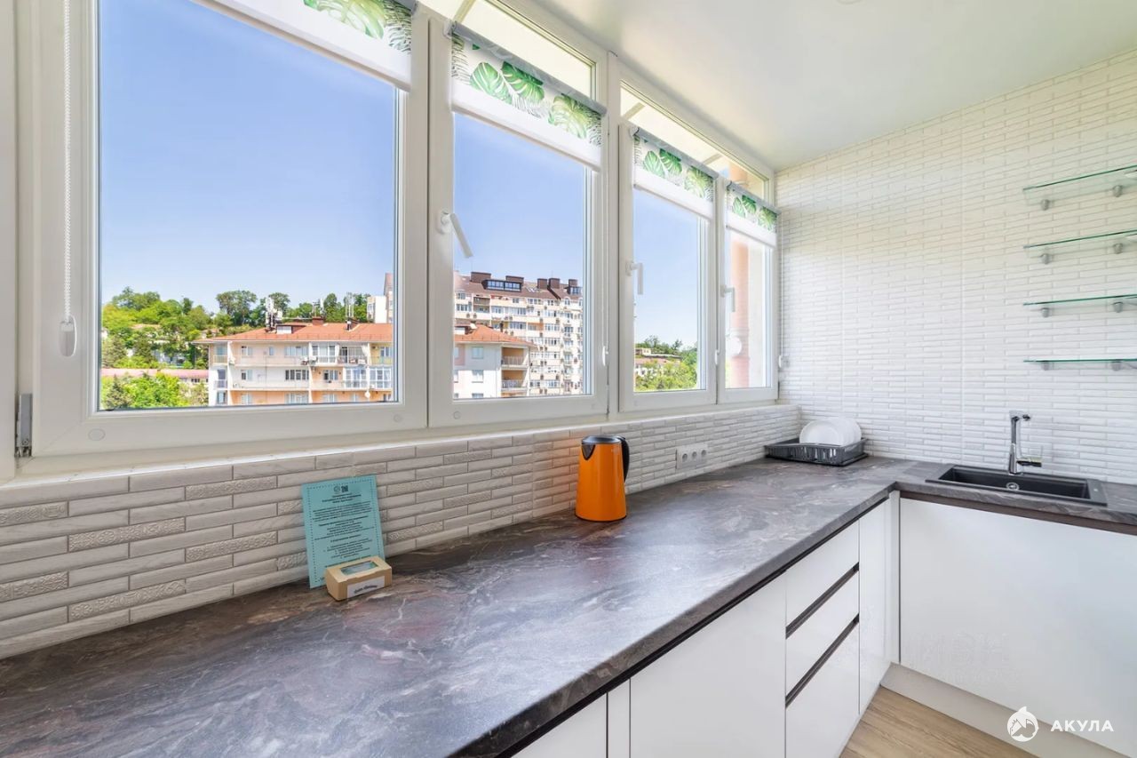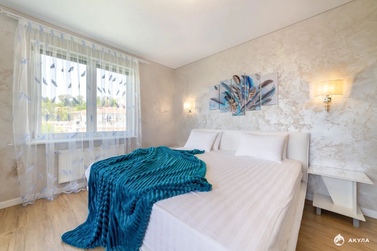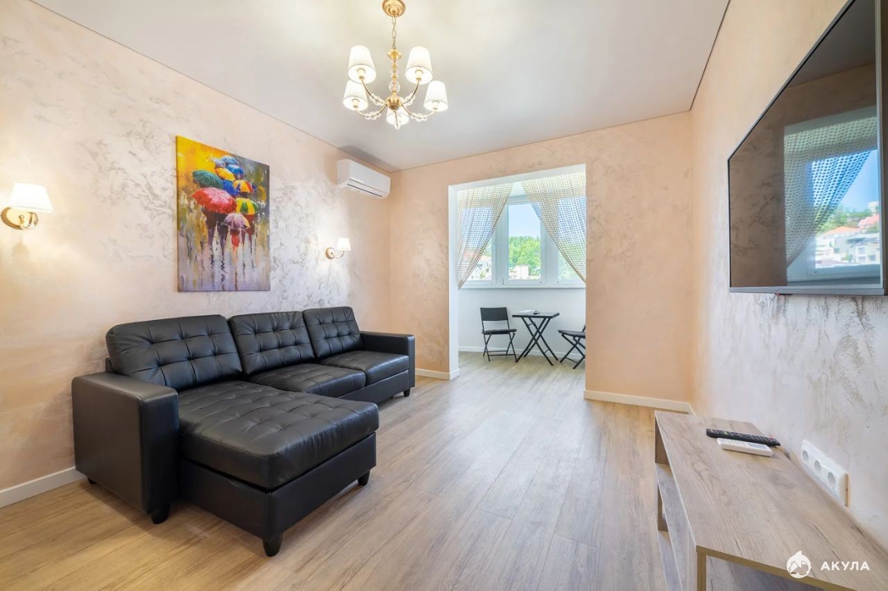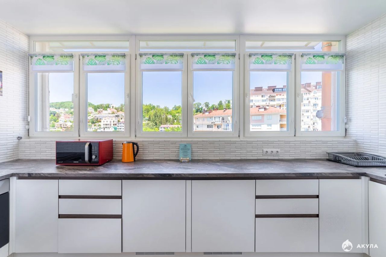 просторная кухня гостиная укомплектованная мебелью и техникой, две большие изолированный комнаты укомплектованные полностью мебелью, два санузла, большой коридор, три балкона с видом на море.