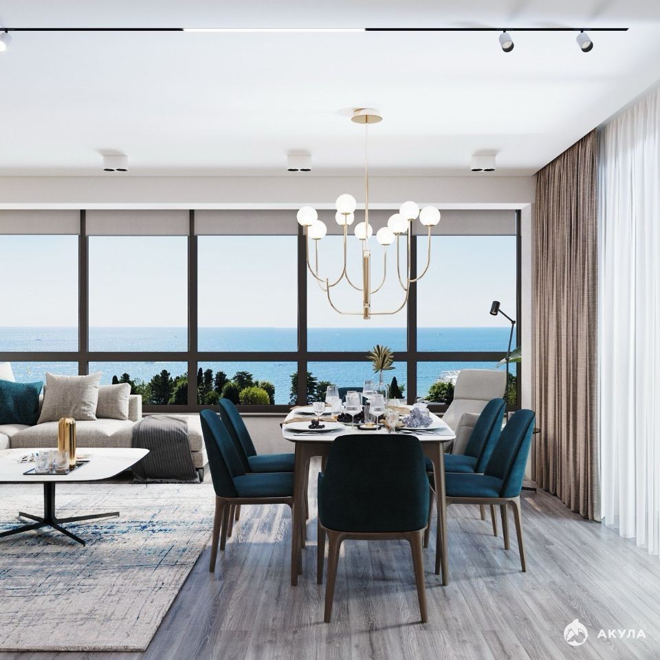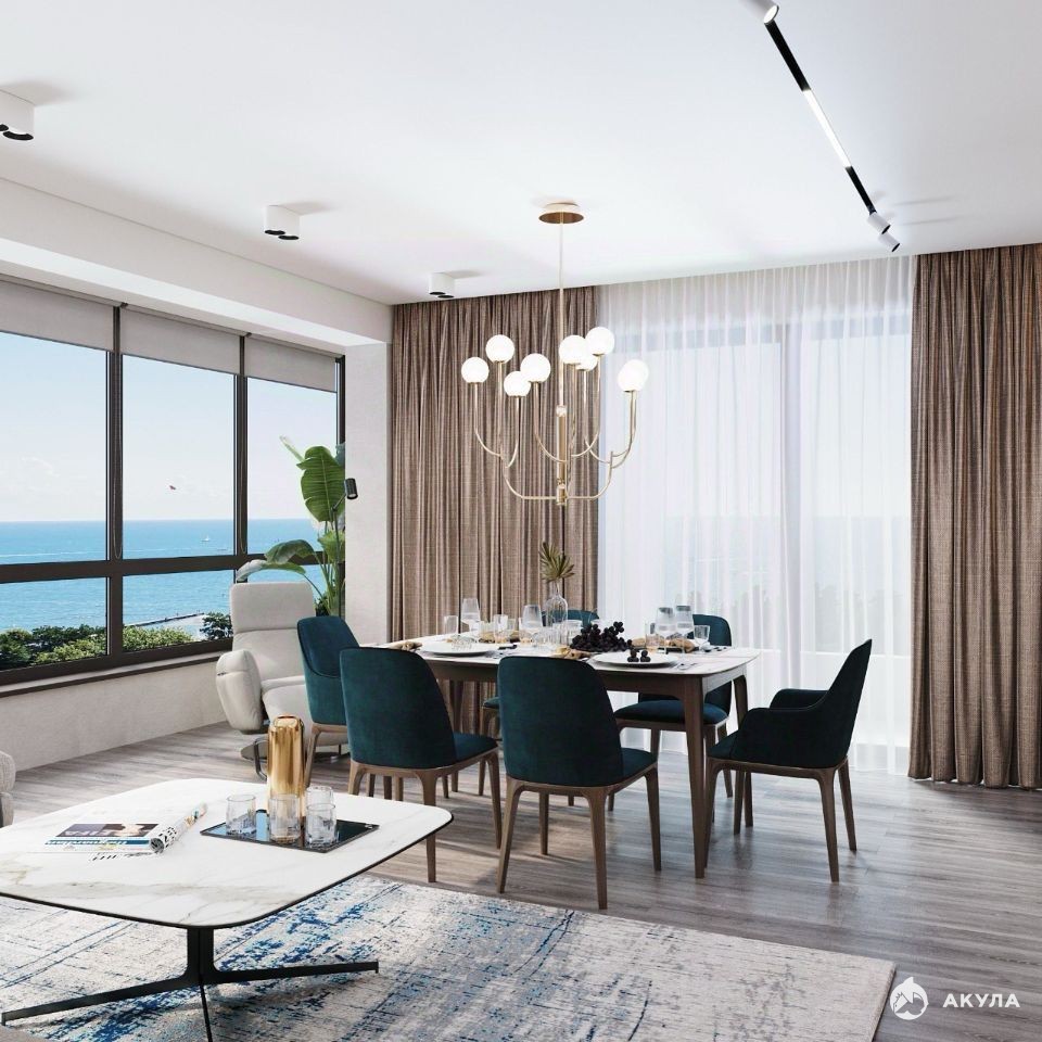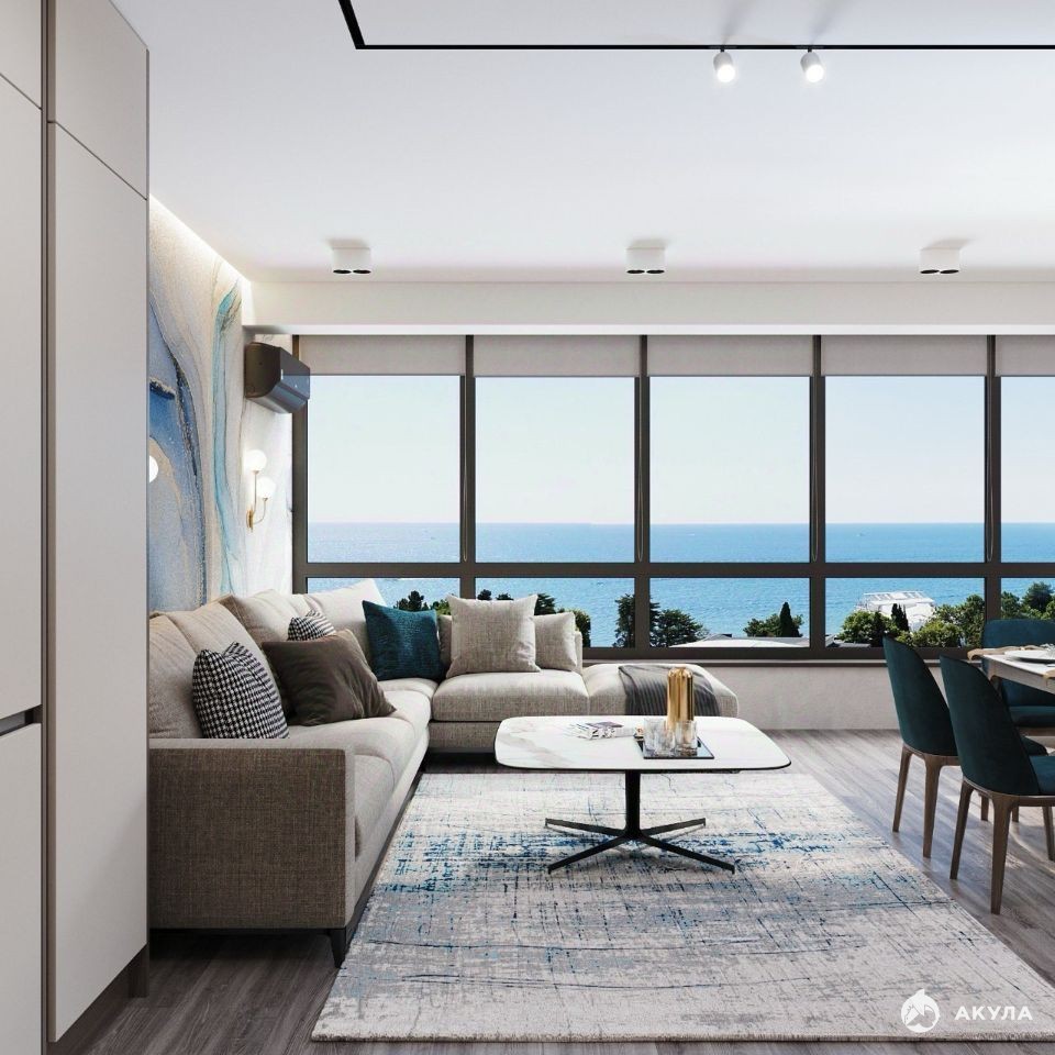 Благодаря панорамному остеклению апартаментов, с окон открываются панорамные виды на морские пейзажи. Только представьте, как Вы утром выходите на свою большую террасу и любуясь видами на морское побережье и горы, выпиваете чашечку кофе.
