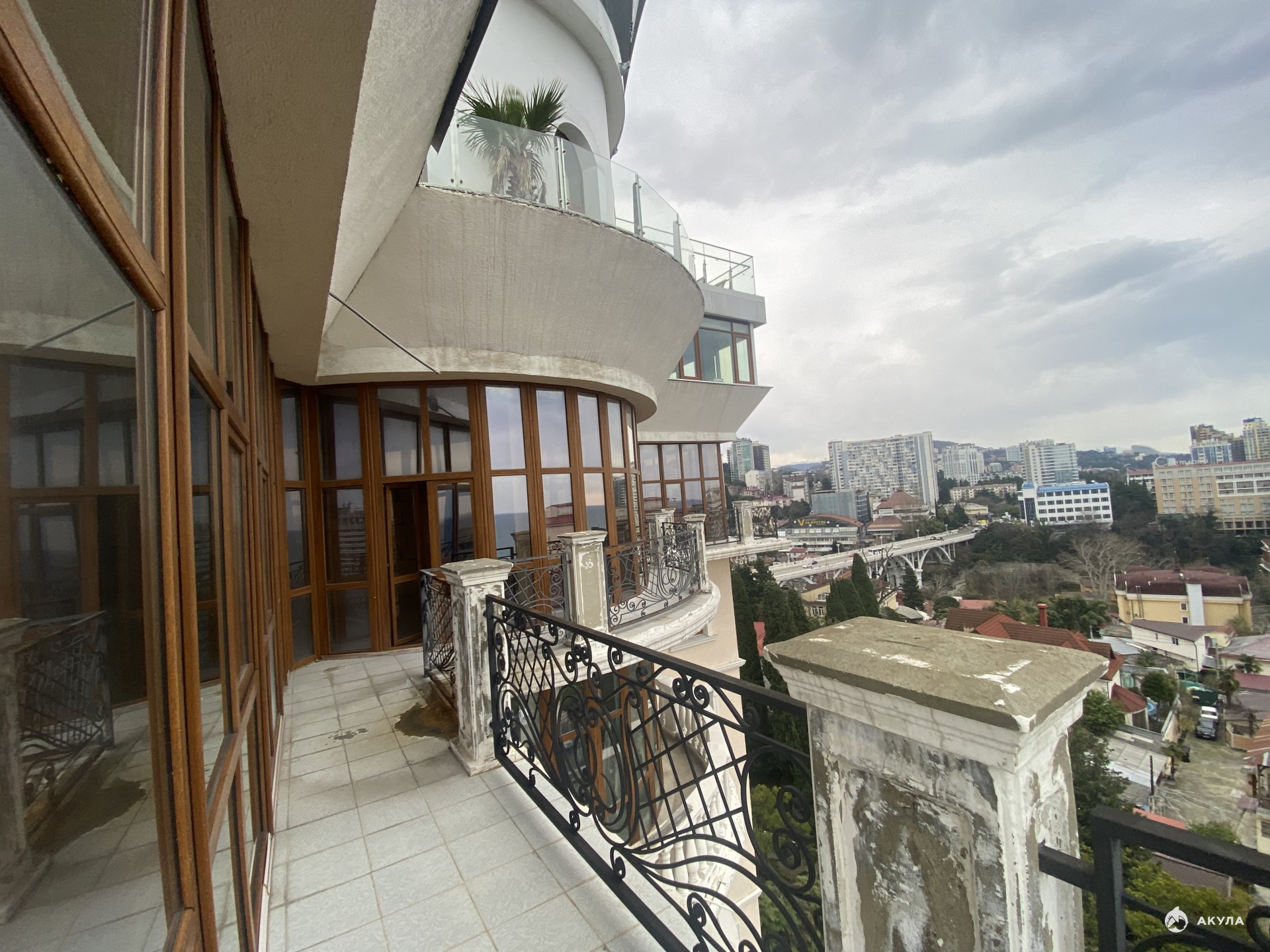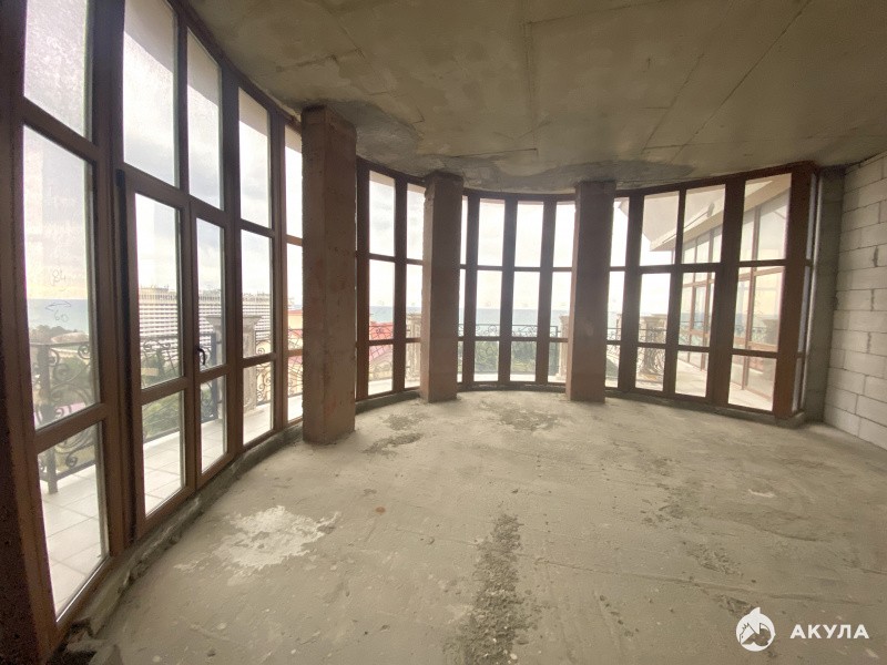 Площадь 800 метров. Пентхаус имеет свободную планировку, панорамное остекление и изящные полукруглые эркеры в залах. Пространство легко планируется. Прямой вид на море.