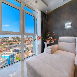 Квартира в комплексе бизнес-класса с дизайнерским ремонтом, дорогой мебелью и техникой. Квартира 100м2, 2 изолированные спальни, гостиная, кухня-столовая, 2 жилые лоджии, гардеробная, санузел. Высокий этаж, панорамное остекление, потрясающий вид на море и город. В квартире...
