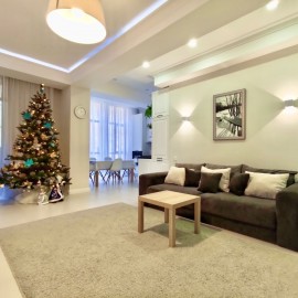 Квартира 160 м2 в ЖК Розмарин на улице Эстонская на Курорте Красная Поляна. Современный интерьер в светлых тонах. Функциональная мебель и техника. Грамотно распланированное пространство в кухню-гостиную, три спальни с санузлами, гардеробные, терраса, балкон. ЖК Розмарин...