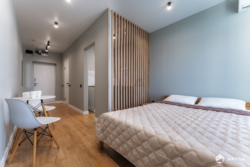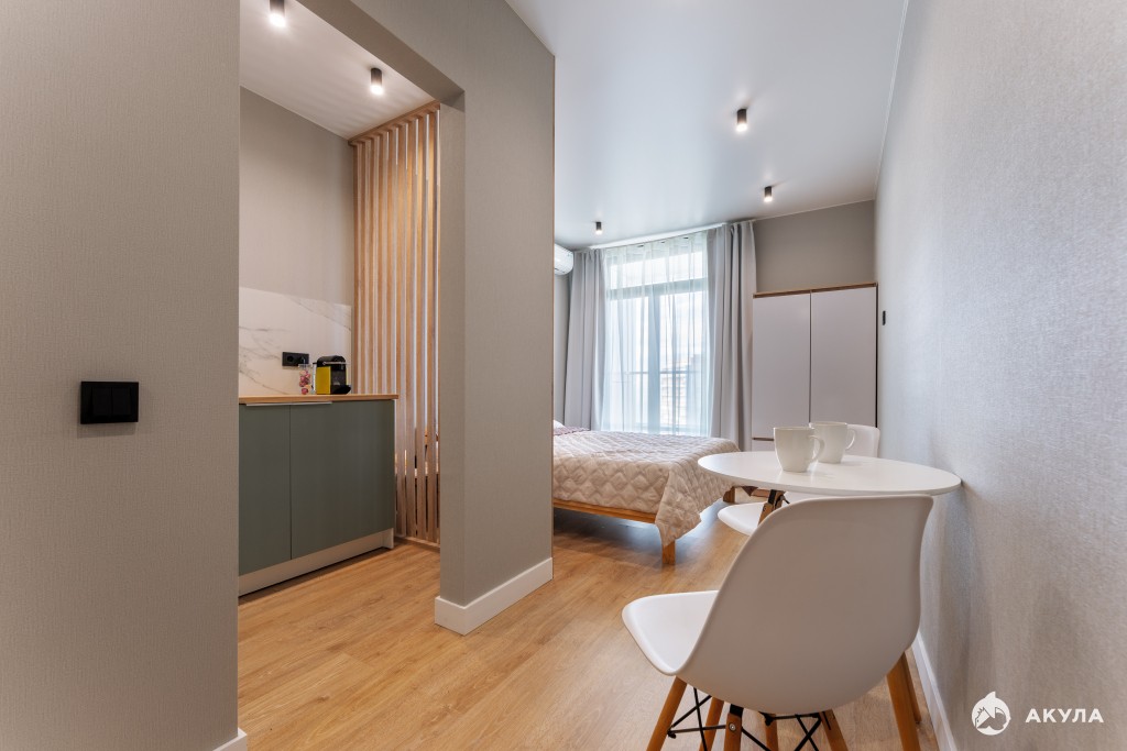 Представь: ты просыпаешься в удобной двуспальной кровати в светлой комнате с большими окнами. Готовишь кофе на мини-кухне, а вечером наслаждаесь уединением в своем стильном, новом пространстве.