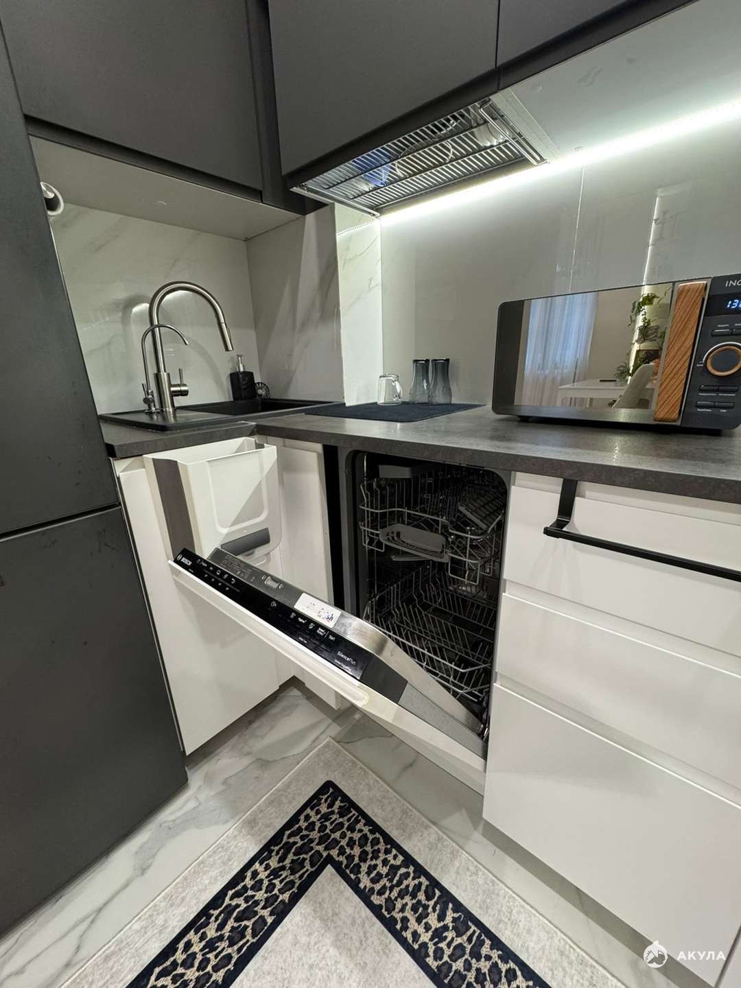 Кровать, диван- кровать, кондиционер, кухонная зона, духовой шкаф, микроволновая печь, чайник, стиральная машинка, посудомоечная машина, телевизор, необходимая посуда, душевая, тёплые полы по всей квартире.